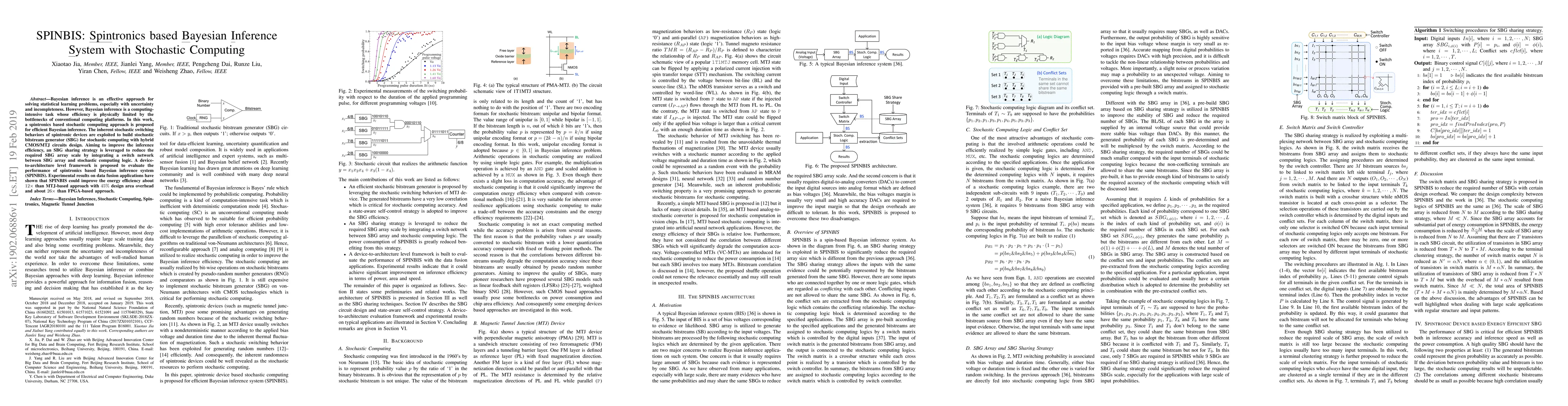 This paper proposes SPINBIS, a spintronics-based Bayesian inference system utilizing stochastic computing to enhance efficiency. The system leverages spintronic devices for stochastic bitstream generation, optimizing performance through an SBG sharing strategy, and demonstrates significant energy efficiency improvements over conventional MTJ and FPGA-based approaches.