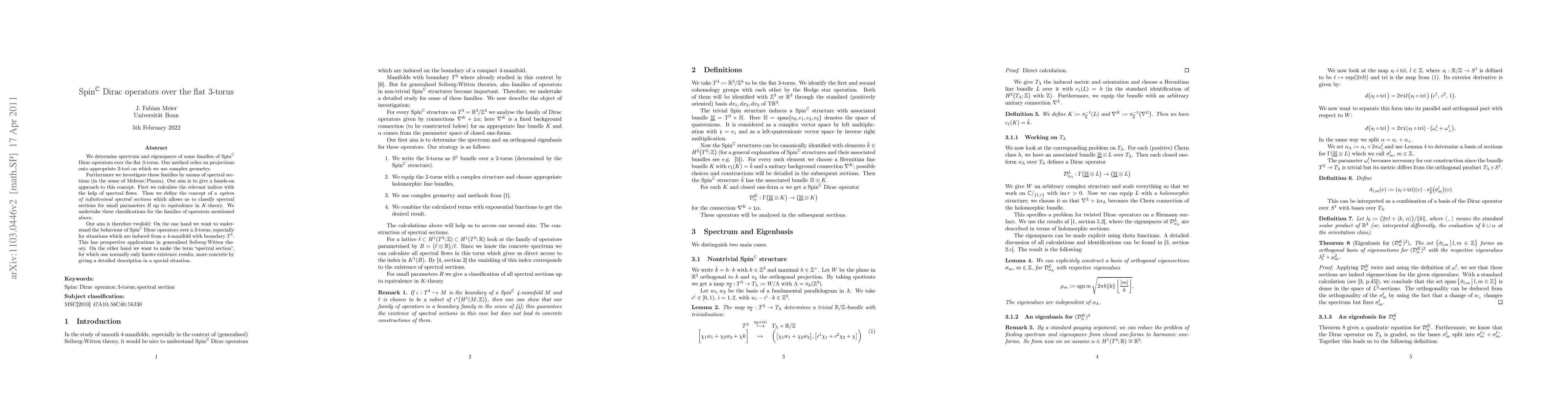Researchers studied Spinc Dirac operators on a flat 3-torus, calculating spectra and eigenbases for specific families of operators and constructing spectral sections with small disturbance parameters.