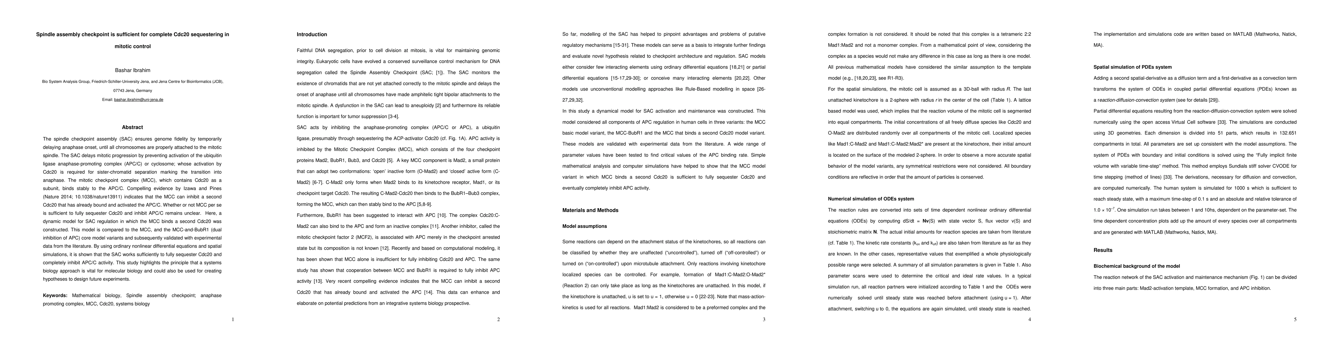 The spindle assembly checkpoint (SAC) is sufficient to fully sequester Cdc20 and inhibit the anaphase-promoting complex (APC/C) activity, ensuring proper mitotic progression. A dynamic model demonstrates that the mitotic checkpoint complex (MCC) alone can inhibit APC/C, validated by experimental data and simulations.