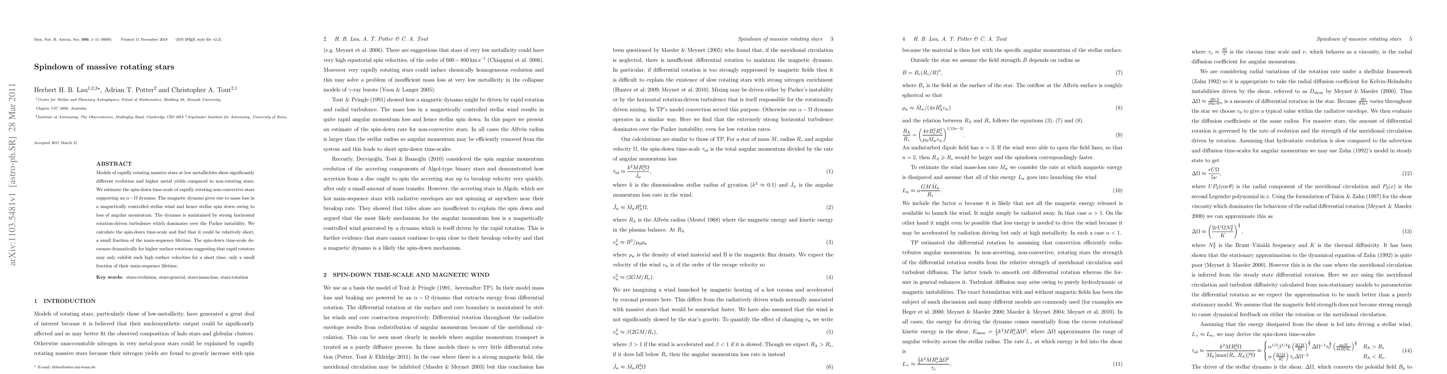 Models of rapidly rotating massive stars at low metallicities show significantly different evolution and higher metal yields compared to non-rotating stars. We estimate the spin-down time-scale of rapid rotating non-convective stars supporting an alpha-Omega dynamo. The magnetic dynamo gives rise to mass loss in a magnetically controlled stellar wind and hence stellar spin down owing to loss of angular momentum. The dynamo is maintained by strong horizontal rotation-driven turbulence which dominates over the Parker instability. We calculate the spin-down time-scale and find that it could be relatively short, a small fraction of the main-sequence lifetime. The spin-down time-scale decreases dramatically for higher surface rotations suggesting that rapid rotators may only exhibit such high surface velocities for a short time, only a small fraction of their main-sequence lifetime.