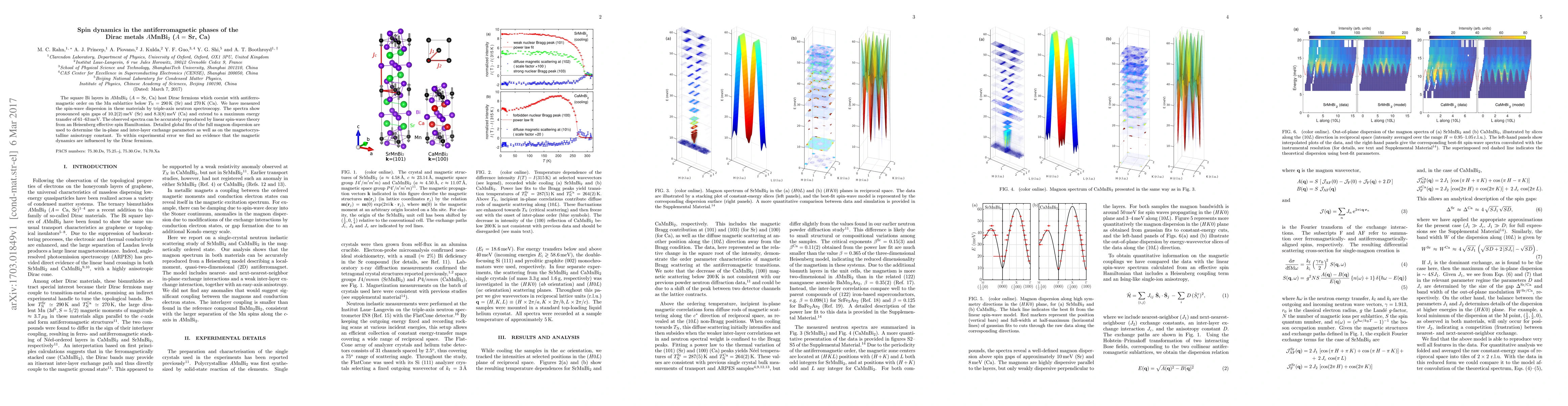 This study investigates the spin dynamics in antiferromagnetic phases of Dirac metals $A$MnBi$_2$ (where $A$ = Sr, Ca) using triple-axis neutron spectroscopy, revealing pronounced spin gaps and confirming the influence of antiferromagnetic order without interaction with Dirac fermions.