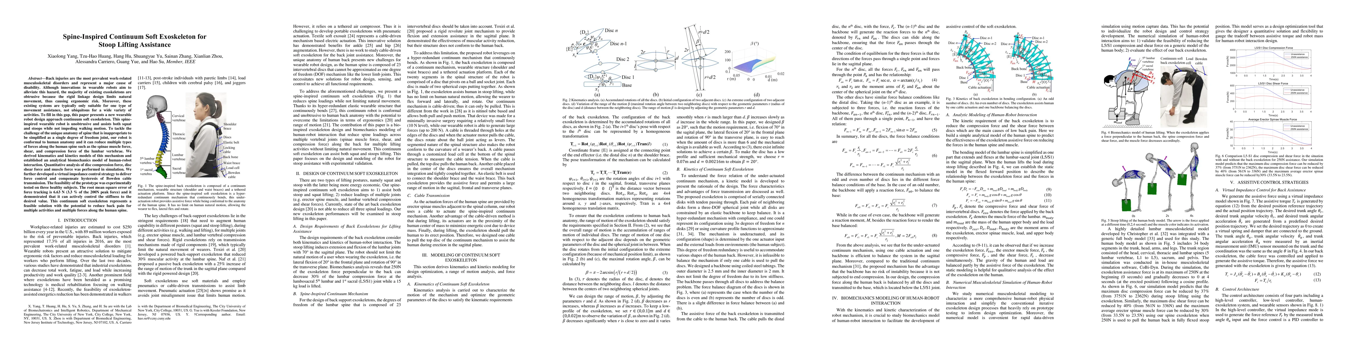 A new spine-inspired continuum soft exoskeleton was developed to assist with stoop lifting and provide ergonomic support for back injuries, demonstrating effective force control and reduced root mean square error in a feasibility test.