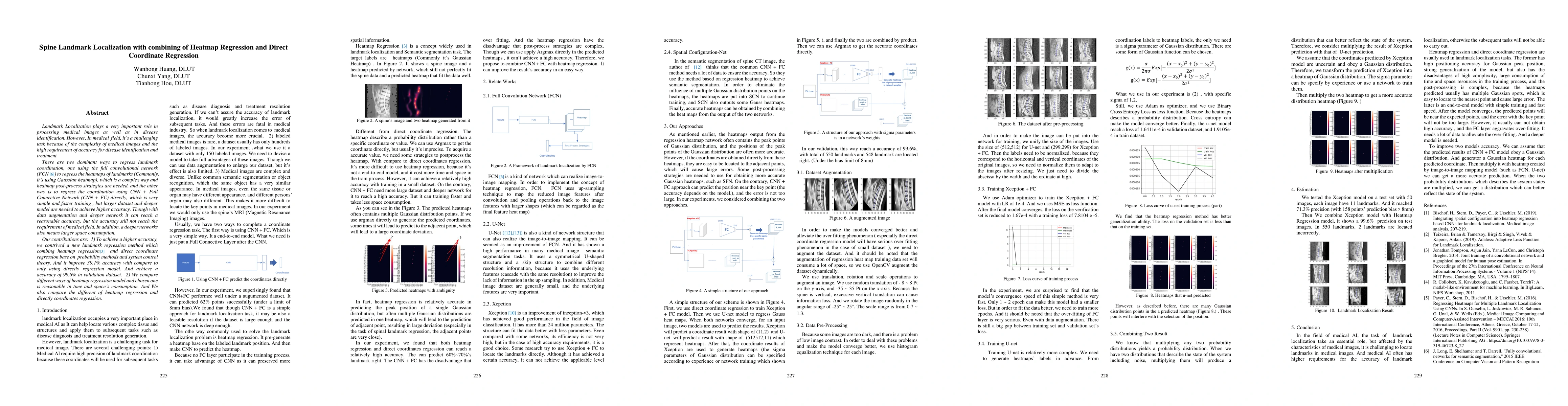 This paper proposes a novel spine landmark localization method combining heatmap regression and direct coordinate regression to enhance accuracy in medical image analysis. The approach aims to balance the complexity and efficiency of existing methods, achieving higher precision with reduced space consumption.