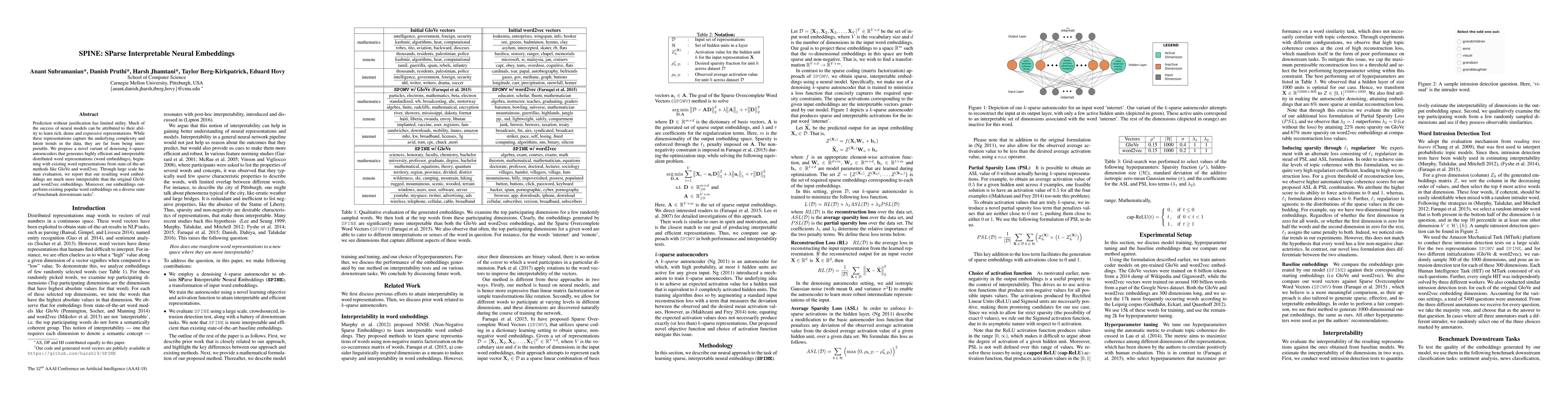 The paper introduces SPINE, a novel denoising k-sparse autoencoder for generating sparse and interpretable word embeddings from existing dense representations like GloVe and word2vec. The resulting embeddings are shown to be more interpretable through human evaluation and outperform original dense embeddings on various downstream tasks.