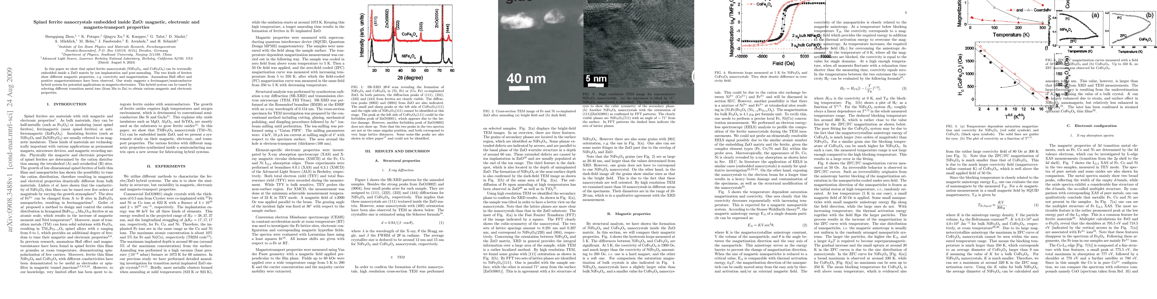 This study embeds spinel ferrite nanocrystals (NiFe2O4, CoFe2O4) within a ZnO matrix via ion implantation and annealing, revealing distinct magnetic properties and anomalous Hall effect. The hybrid system shows potential for magneto-electronics applications.