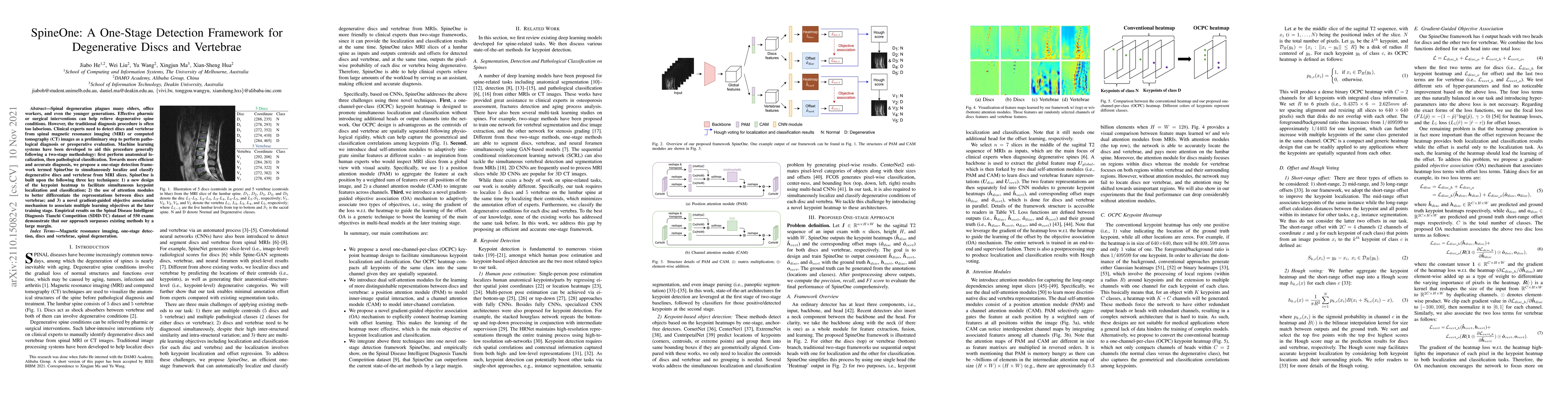 SpineOne is a one-stage detection framework designed to simultaneously localize and classify degenerative discs and vertebrae in MRI slices, surpassing traditional two-stage methods. It employs keypoint heatmaps, attention modules, and a gradient-guided objective association mechanism, achieving superior performance on the SDID-TC dataset.
