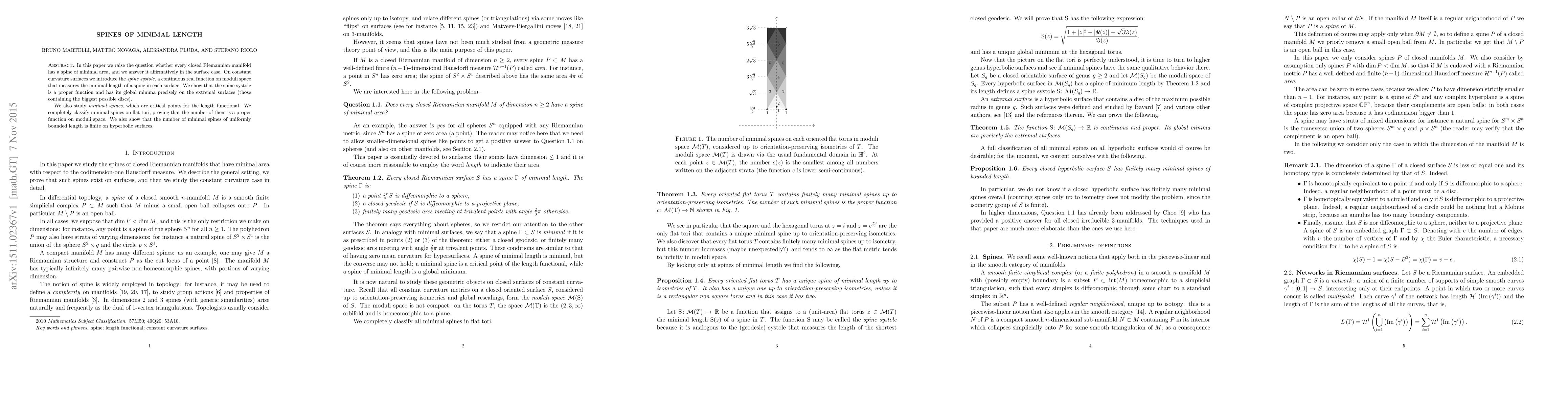 In this paper we raise the question whether every closed Riemannian manifold has a spine of minimal area, and we answer it affirmatively in the surface case. On constant curvature surfaces we introduce the spine systole, a continuous real function on moduli space that measures the minimal length of a spine in each surface. We show that the spine systole is a proper function and has its global minima precisely on the extremal surfaces (those containing the biggest possible discs). We also study minimal spines, which are critical points for the length functional. We completely classify minimal spines on flat tori, proving that the number of them is a proper function on moduli space. We also show that the number of minimal spines of uniformly bounded length is finite on hyperbolic surfaces.