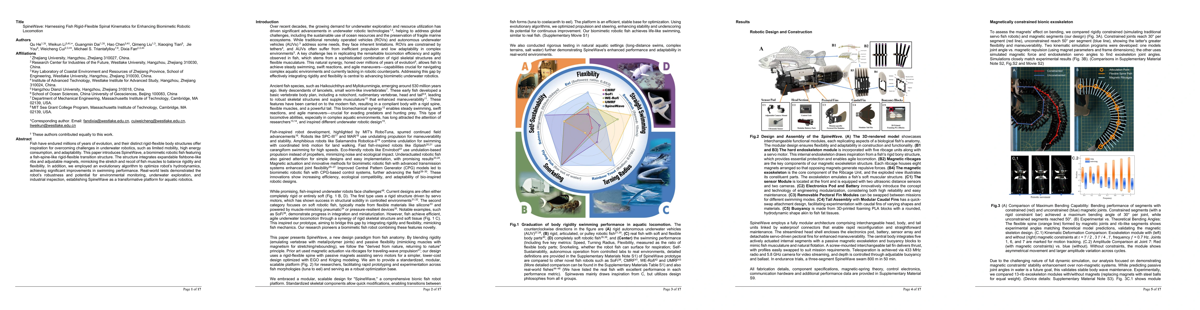 The main technical contribution is the development of SpineWave, a biomimetic robotic fish with a novel rigid-flexible transition structure and optimized hydrodynamics via evolutionary algorithms.