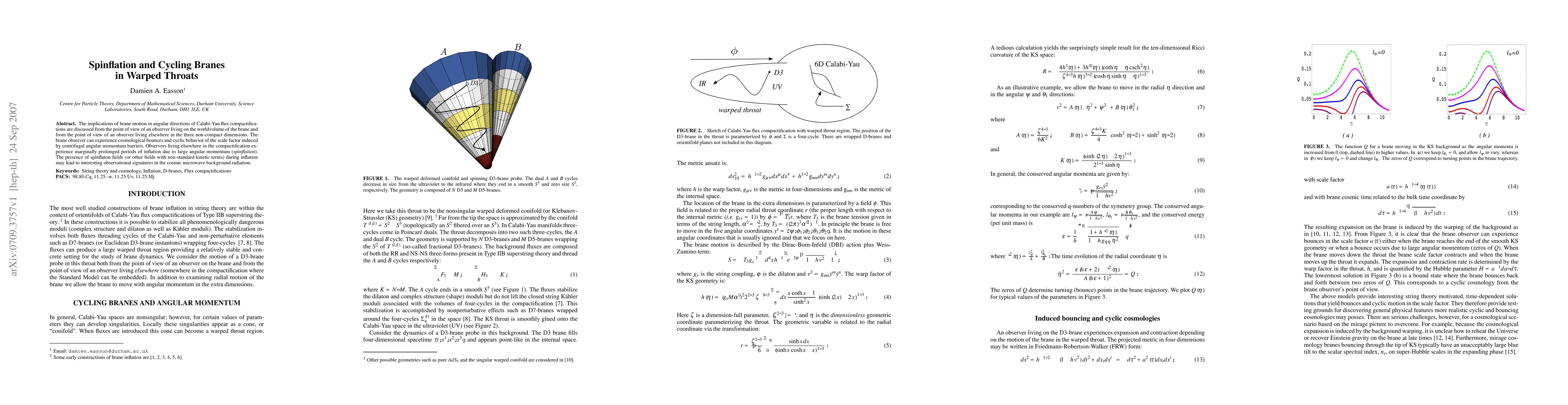 The implications of brane motion in angular directions of Calabi-Yau flux compactifications are discussed from the point of view of an observer living on the worldvolume of the brane and from the point of view of an observer living elsewhere in the three non-compact dimensions. The brane observer can experience cosmological bounces and cyclic behavior of the scale factor induced by centrifugal angular momentum barriers. Observers living elsewhere in the compactification experience marginally prolonged periods of inflation due to large angular momentum (spinflation). The presence of spinflaton fields (or other fields with non-standard kinetic terms) during inflation may lead to interesting observational signatures in the cosmic microwave background radiation.