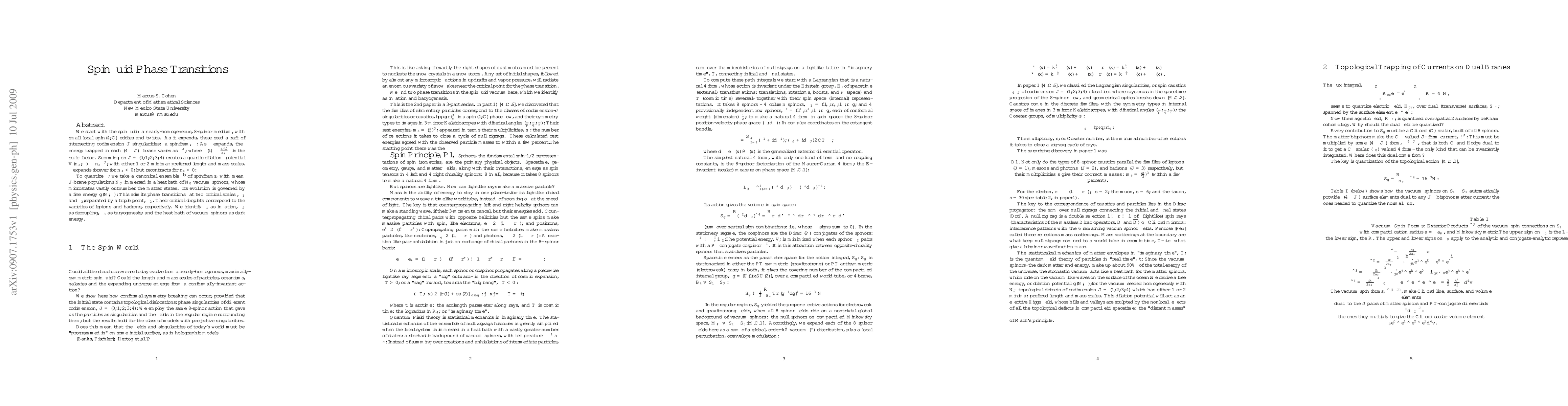 We start with the spinfluid: a nearly-homogeneous, 8-spinor medium, with small local eddies and twists. As it expends, these seed a raft of intersecting codimension-J singularities: a spinfoam. As this expands, the energy trapped in each (4-J) brane varies as the Jth power of the scale factor. Summing on J=(0,1,2,3,4) creates a quartic dilation potential with either 1 or 2 minima: preferred length and mass scales. The spinfoam expands forever with 1 minimum, but recontracts with 2. To quantize it, we take a canonical ensemble of spinfoams, immersed in a heat bath of vacuum spinors, whose microstates vastly outnumber the matter states. It's evolution is governed by a free energy which admits phase transitions at two critical scale, separated by a triple point.Their critical droplets correspond to the varieties of leptons and hadrons.We identify the first as inflation, the second as baryogenesis; and the heat bath of vacuum spinors as dark energy.
