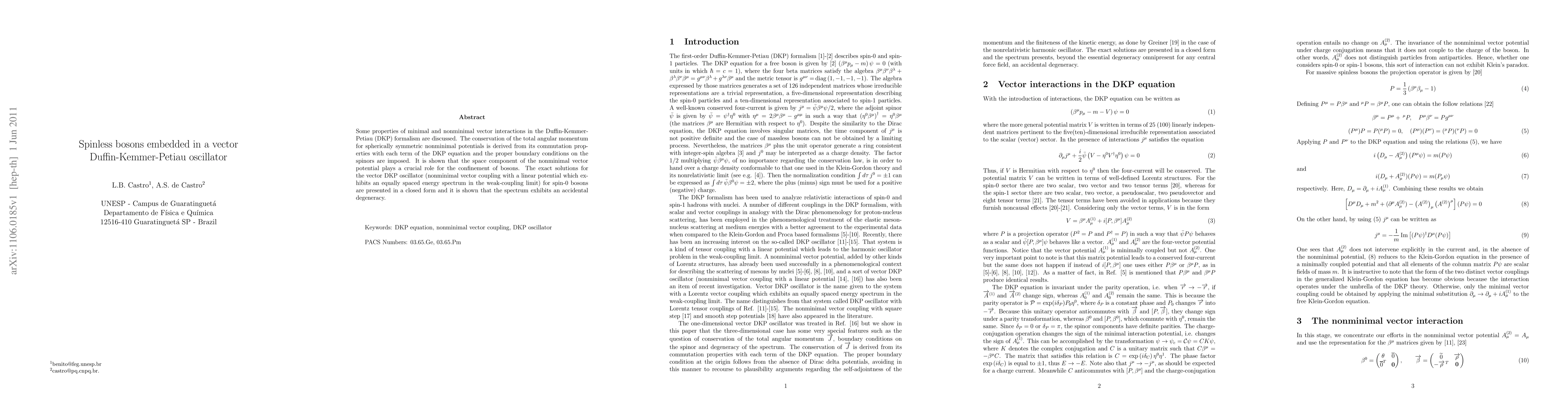 Some properties of minimal and nonminimal vector interactions in the Duffin-Kemmer-Petiau (DKP) formalism are discussed. The conservation of the total angular momentum for spherically symmetric nonminimal potentials is derived from its commutation properties with each term of the DKP equation and the proper boundary conditions on the spinors are imposed. It is shown that the space component of the nonminimal vector potential plays a crucial role for the confinement of bosons. The exact solutions for the vector DKP oscillator (nonminimal vector coupling with a linear potential which exhibits an equally spaced energy spectrum in the weak-coupling limit) for spin-0 bosons are presented in a closed form and it is shown that the spectrum exhibits an accidental degeneracy.
