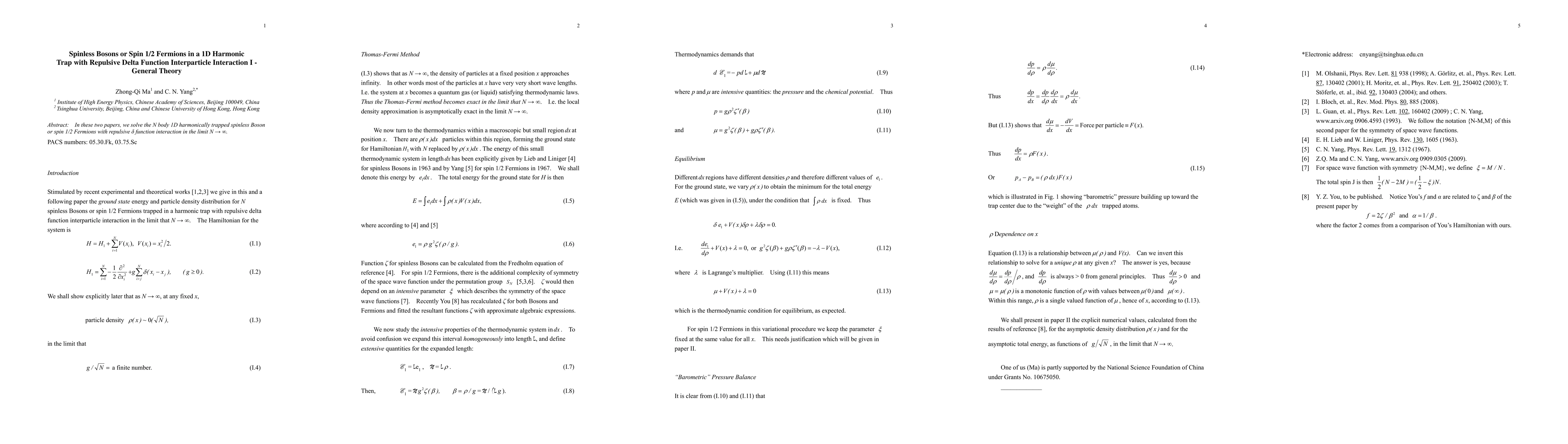 In these two papers, we solve the N body 1D harmonically trapped spinless Boson or spin 1/2 Fermions with repulsive delta function interaction in the limit $N\to \infty$.