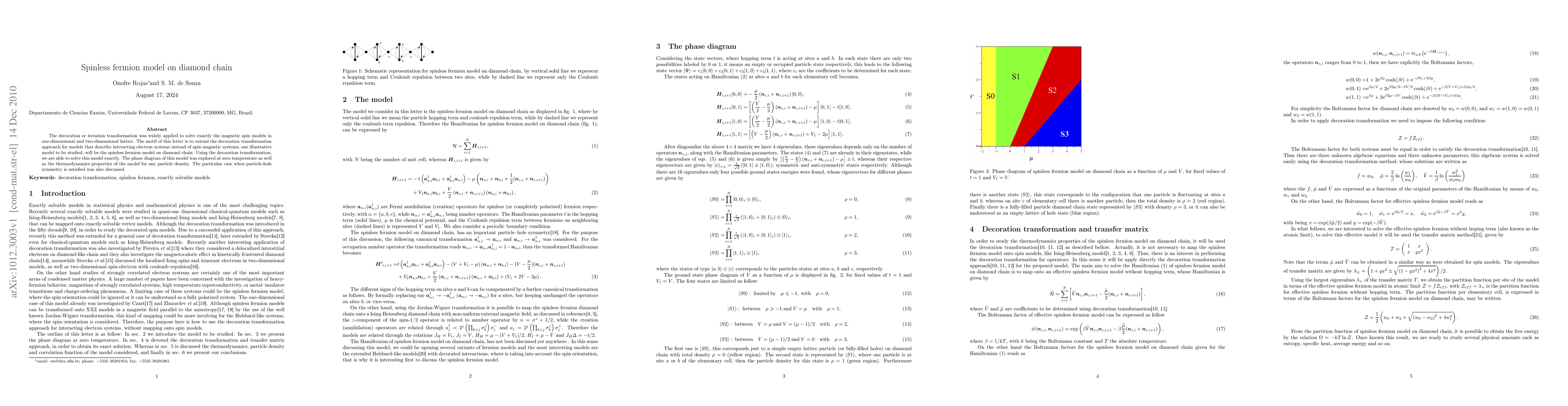 The decoration or iteration transformation was widely applied to solve exactly the magnetic spin models in one-dimensional and two-dimensional lattice. The motif of this letter is to extend the decoration transformation approach for models that describe interacting electron systems instead of spin magnetic systems, one illustrative model to be studied, will be the spinless fermion model on diamond chain. Using the decoration transformation, we are able to solve this model exactly. The phase diagram of this model was explored at zero temperature as well as the thermodynamics properties of the model for any particle density. The particular case when particle-hole symmetry is satisfied was also discussed.