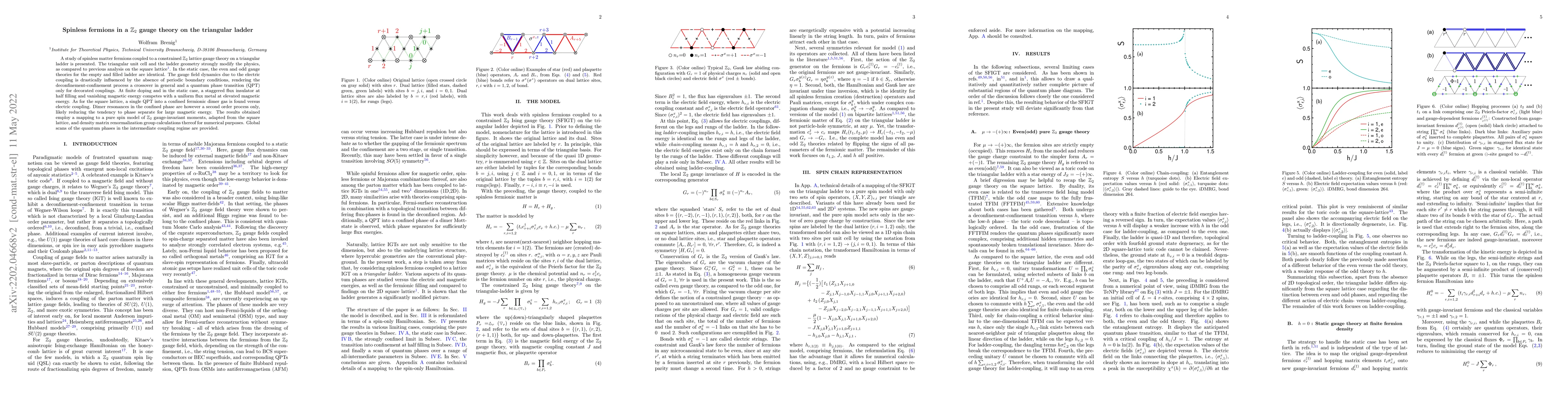 This paper investigates spinless fermions in a $\mathbb{Z}_{2}$ gauge theory on a triangular ladder, revealing distinct physics from the square lattice due to the ladder geometry. It finds a crossover to deconfinement rather than a quantum phase transition, except for decorated couplings, and identifies a staggered flux insulator versus a uniform flux metal at varying magnetic energy levels.