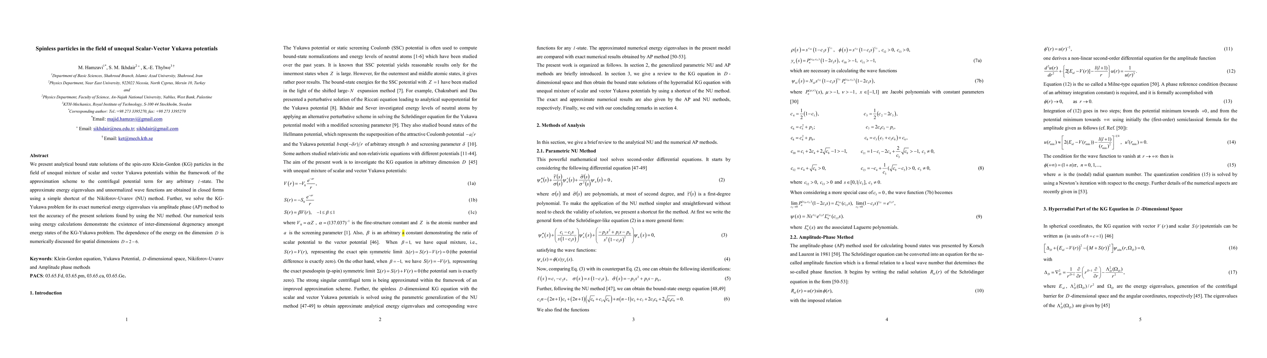This paper finds bound state solutions for spinless particles in a field of unequal scalar-vector Yukawa potentials, demonstrating inter-dimensional degeneracy amongst energy states.
