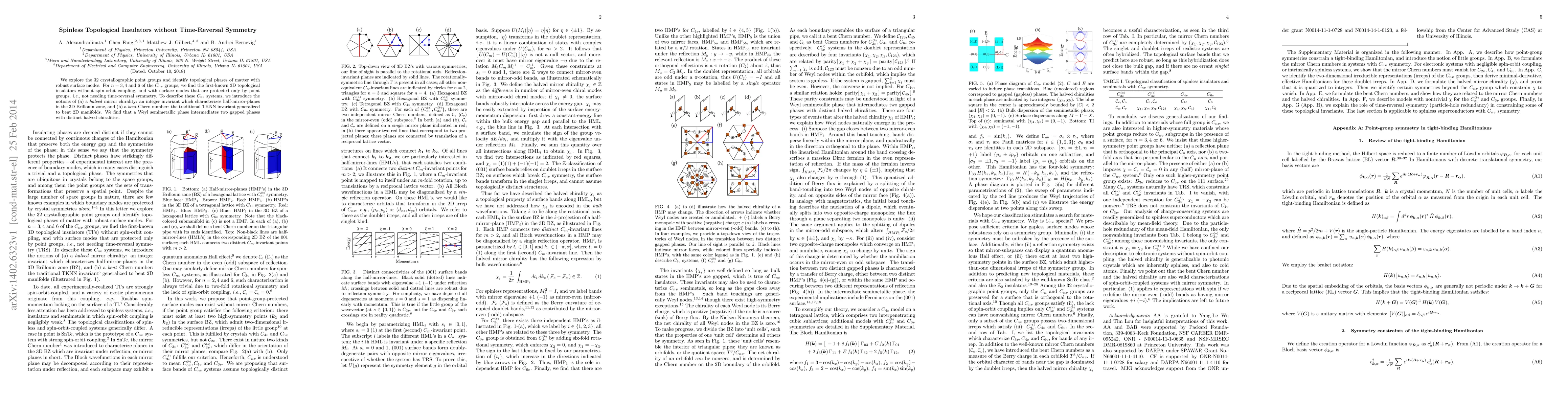 This research identifies the first 3D topological insulators within specific C_{nv} crystallographic point groups (n=3,4,6) without spin-orbit coupling, protected by point group symmetries rather than time-reversal symmetry. It introduces concepts like halved mirror chirality and bent Chern number to describe these novel phases.