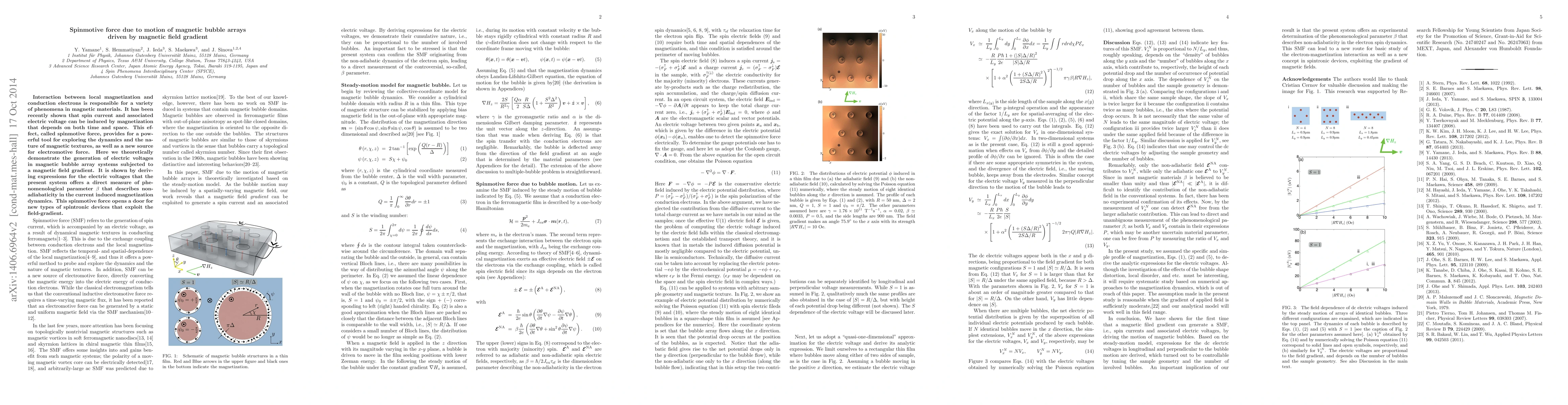 This paper theoretically demonstrates the generation of spinmotive force in magnetic bubble array systems driven by a magnetic field gradient, providing a new method for exploring magnetic dynamics and a potential source for electromotive force in spintronic devices. The study derives expressions for electric voltages that reveal a phenomenological parameter describing non-adiabatic magnetization dynamics.
