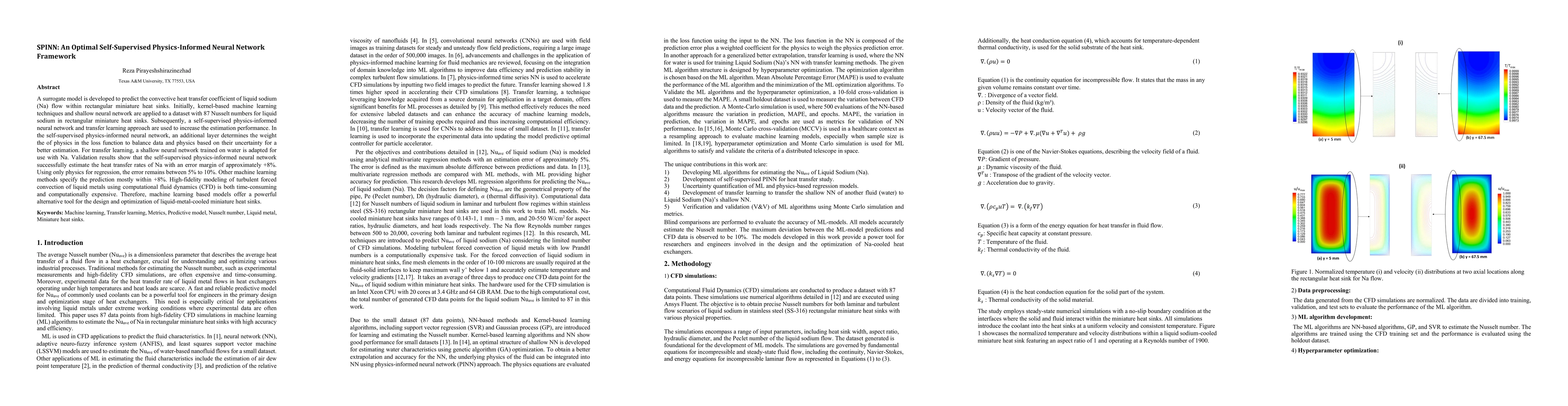 A surrogate model is developed to predict the convective heat transfer coefficient of liquid sodium (Na) flow within rectangular miniature heat sinks. Initially, kernel-based machine learning techniques and shallow neural network are applied to a dataset with 87 Nusselt numbers for liquid sodium in rectangular miniature heat sinks. Subsequently, a self-supervised physics-informed neural network and transfer learning approach are used to increase the estimation performance. In the self-supervised physics-informed neural network, an additional layer determines the weight the of physics in the loss function to balance data and physics based on their uncertainty for a better estimation. For transfer learning, a shallow neural network trained on water is adapted for use with Na. Validation results show that the self-supervised physics-informed neural network successfully estimate the heat transfer rates of Na with an error margin of approximately +8%. Using only physics for regression, the error remains between 5% to 10%. Other machine learning methods specify the prediction mostly within +8%. High-fidelity modeling of turbulent forced convection of liquid metals using computational fluid dynamics (CFD) is both time-consuming and computationally expensive. Therefore, machine learning based models offer a powerful alternative tool for the design and optimization of liquid-metal-cooled miniature heat sinks.