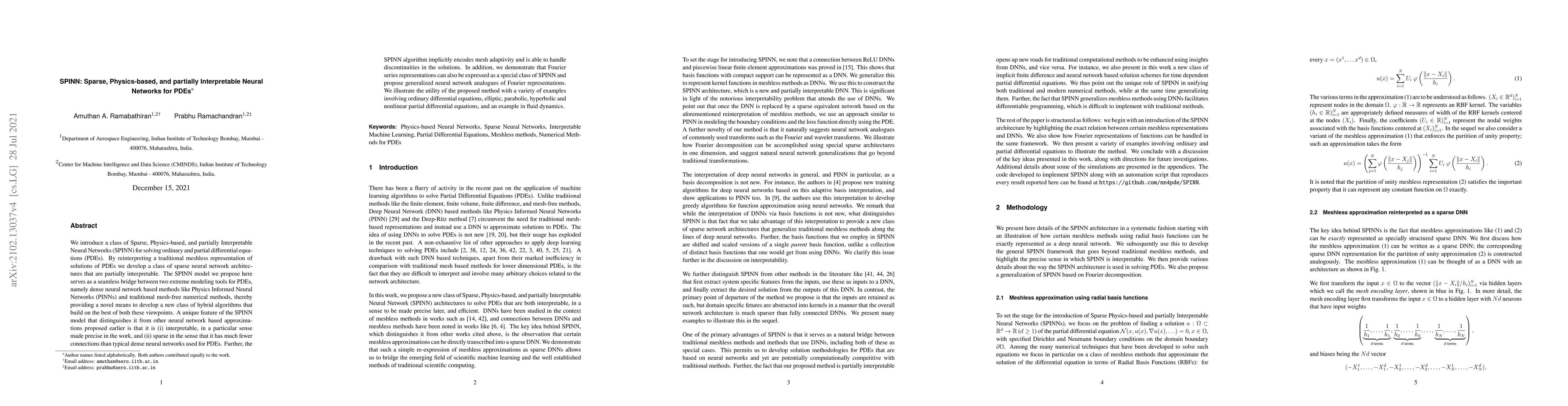 The paper introduces SPINN, a novel sparse, physics-based, and partially interpretable neural network for solving PDEs, bridging dense neural networks and traditional mesh-free methods. The SPINN model is sparse, interpretable, and can handle discontinuities, offering a new hybrid approach to PDE solutions.
