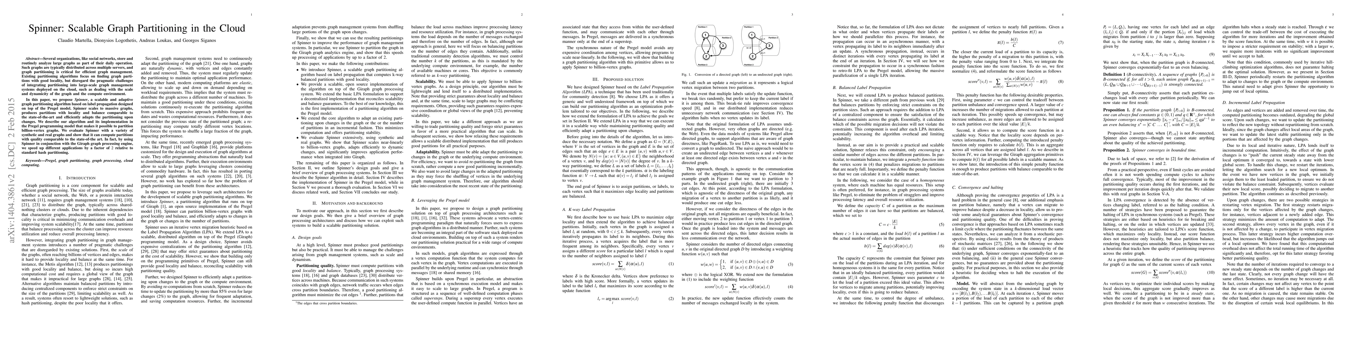 Spinner is a scalable graph partitioning algorithm designed for cloud-based graph management systems, addressing the challenges of graph scale and dynamicity. It leverages label propagation on the Pregel model to efficiently partition massive graphs while maintaining partition locality and balance, and adapts to changes dynamically.