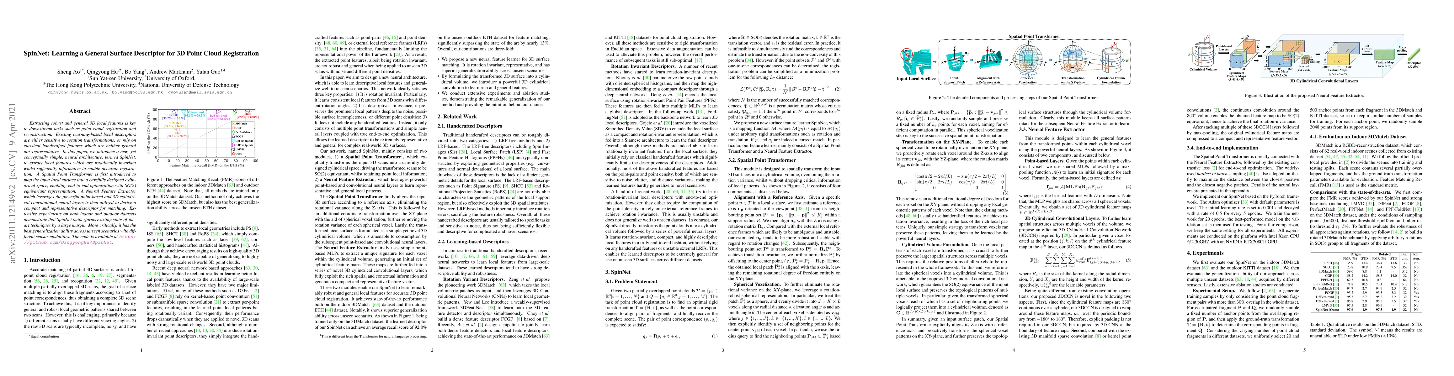 Introduces SpinNet, a neural architecture for extracting rotationally invariant 3D local features from point clouds for tasks like registration and reconstruction. Utilizes a Spatial Point Transformer to map input surfaces into a cylindrical space and a Neural Feature Extractor with 3D cylindrical convolutional layers to derive a compact descriptor.