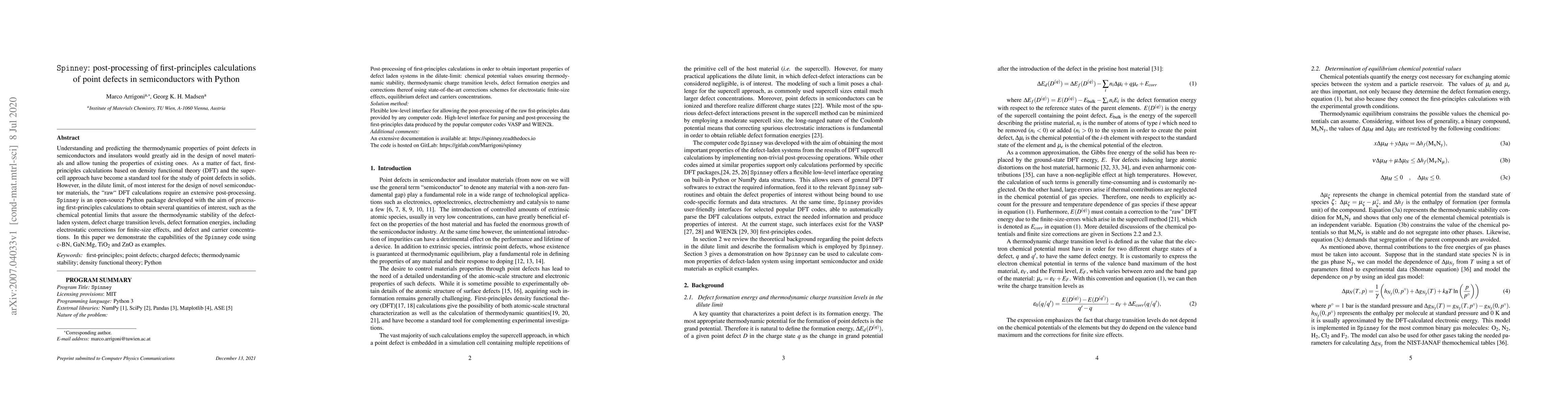 Spinney is an open-source Python package designed to post-process first-principles calculations for point defects in semiconductors, facilitating the extraction of thermodynamic properties and defect formation energies. It demonstrates its utility through examples in c-BN, Mg-doped GaN, TiO2, and ZnO.