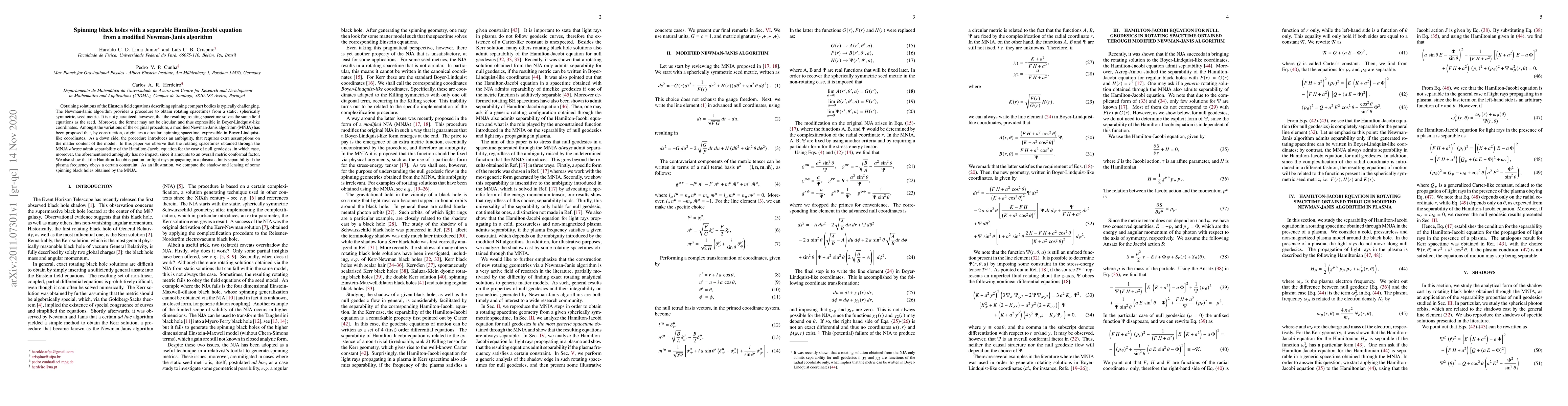 Obtaining solutions of the Einstein field equations describing spinning compact bodies is typically challenging. The Newman-Janis algorithm provides a procedure to obtain rotating spacetimes from a static, spherically symmetric, seed metric. It is not guaranteed, however, that the resulting rotating spacetime solves the same field equations as the seed. Moreover, the former may not be circular, and thus expressible in Boyer-Lindquist-like coordinates. Amongst the variations of the original procedure, a modified Newman-Janis algorithm (MNJA) has been proposed that, by construction, originates a circular, spinning spacetime, expressible in Boyer-Lindquist-like coordinates. As a down side, the procedure introduces an ambiguity, that requires extra assumptions on the matter content of the model. In this paper we observe that the rotating spacetimes obtained through the MNJA always admit separability of the Hamilton-Jacobi equation for the case of null geodesics, in which case, moreover, the aforementioned ambiguity has no impact, since it amounts to an overall metric conformal factor. We also show that the Hamilton-Jacobi equation for light rays propagating in a plasma admits separability if the plasma frequency obeys a certain constraint. As an illustration, we compute the shadow and lensing of some spinning black holes obtained by the MNJA.