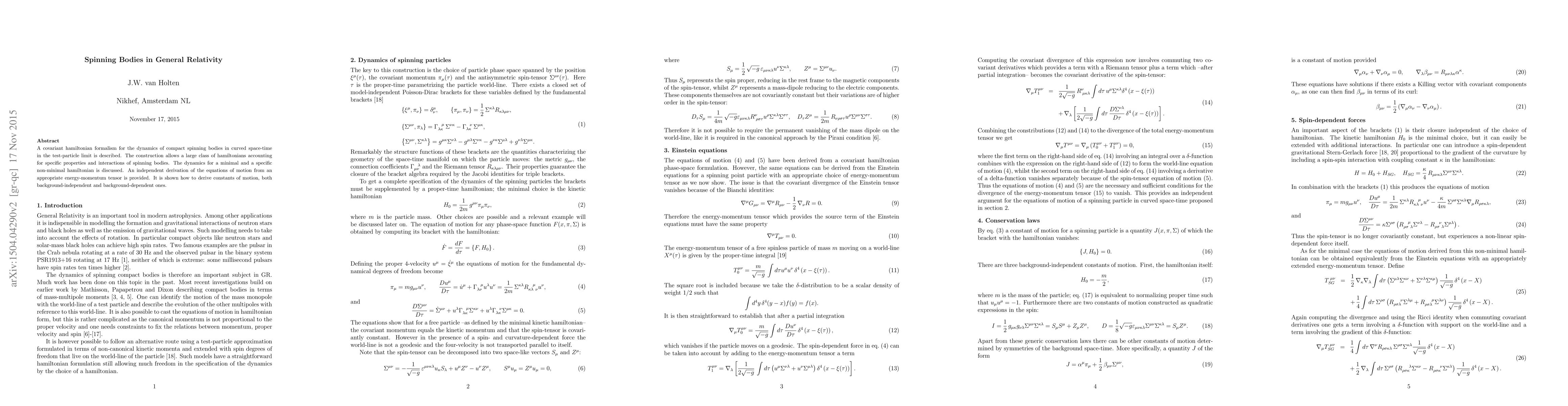 This paper develops a covariant Hamiltonian formalism for the dynamics of spinning compact bodies in curved space-time, focusing on the test-particle limit. It provides a framework for deriving equations of motion and constants of motion for both minimal and non-minimal hamiltonians.