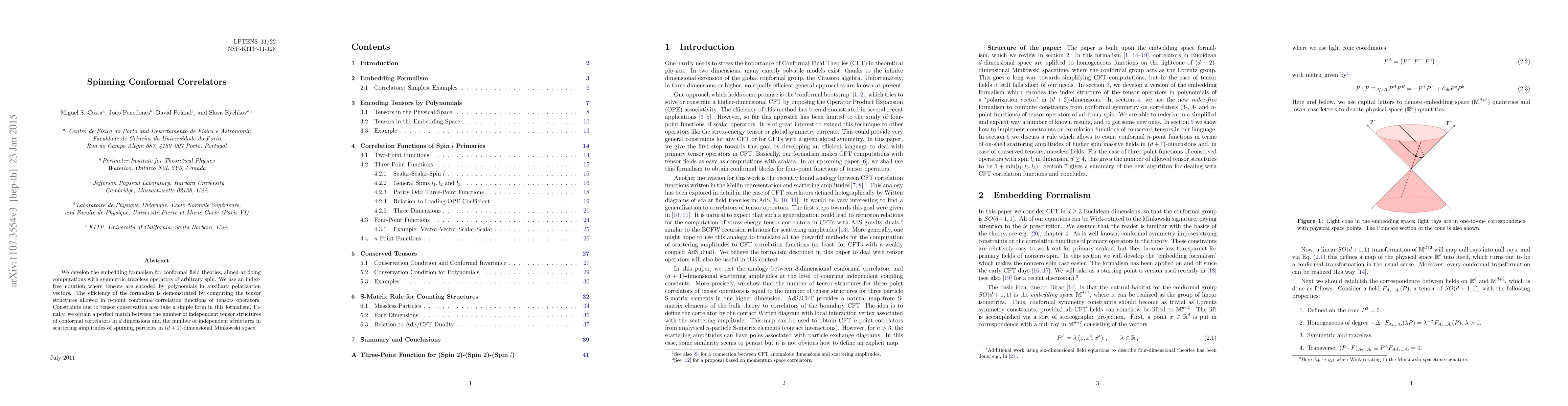 This paper introduces an embedding formalism for conformal field theories to compute n-point correlation functions of tensor operators, showing that the number of independent tensor structures matches those in scattering amplitudes of spinning particles in higher-dimensional Minkowski space. The formalism uses an index-free notation and polynomial encoding of tensors for efficient computation.