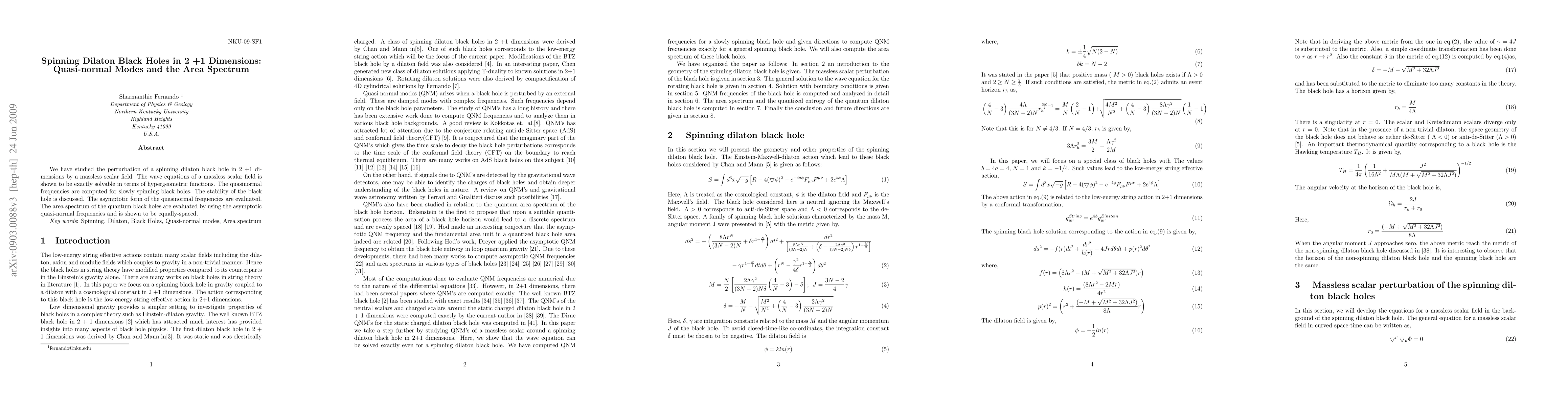 This research investigates the perturbation of spinning dilaton black holes in 2+1 dimensions by a massless scalar field, solving the wave equations in terms of hypergeometric functions and determining quasi-normal modes and an equally-spaced area spectrum for quantum black holes.