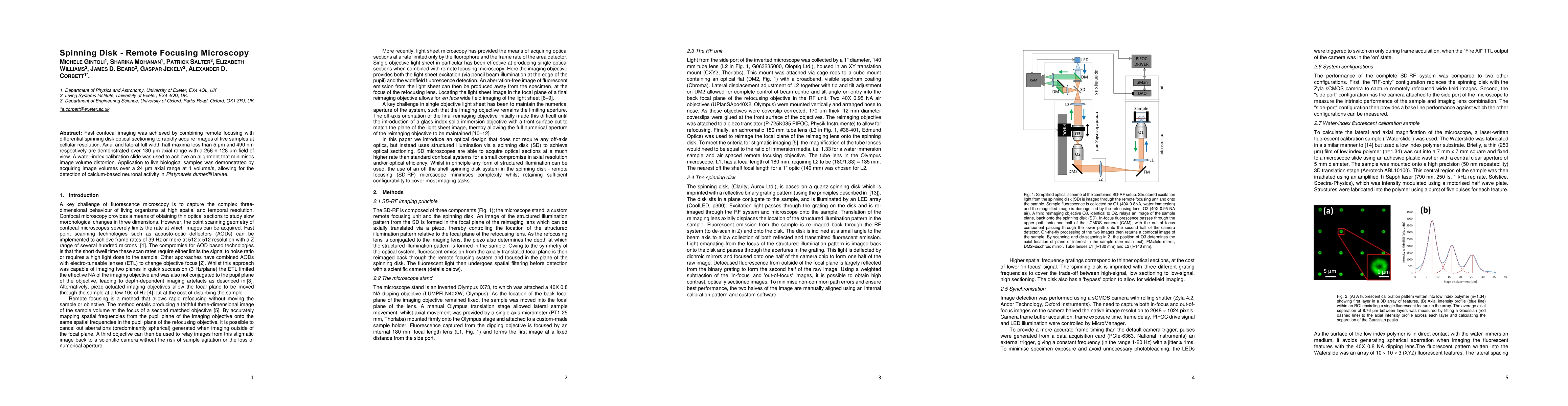 This paper presents a remote focusing microscopy technique that combines differential spinning disk optical sectioning with remote focusing to achieve fast confocal imaging of live samples at cellular resolution. The method demonstrates an axial resolution of less than 5 µm and a lateral resolution of 490 nm over a 130 µm axial range, enabling the detection of calcium-based neuronal activity in Platynereis dumerilii larvae.