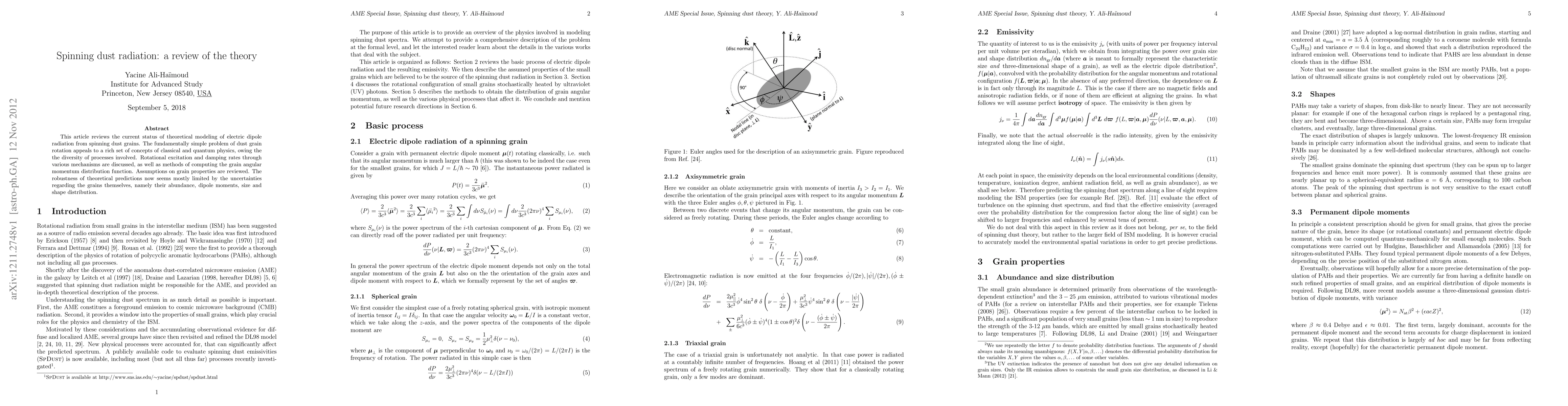 This article reviews the current status of theoretical modeling of electric dipole radiation from spinning dust grains. The fundamentally simple problem of dust grain rotation appeals to a rich set of concepts of classical and quantum physics, owing the the diversity of processes involved. Rotational excitation and damping rates through various mechanisms are discussed, as well as methods of computing the grain angular momentum distribution function. Assumptions on grain properties are reviewed. The robustness of theoretical predictions now seems mostly limited by the uncertainties regarding the grains themselves, namely their abundance, dipole moments, size and shape distribution.