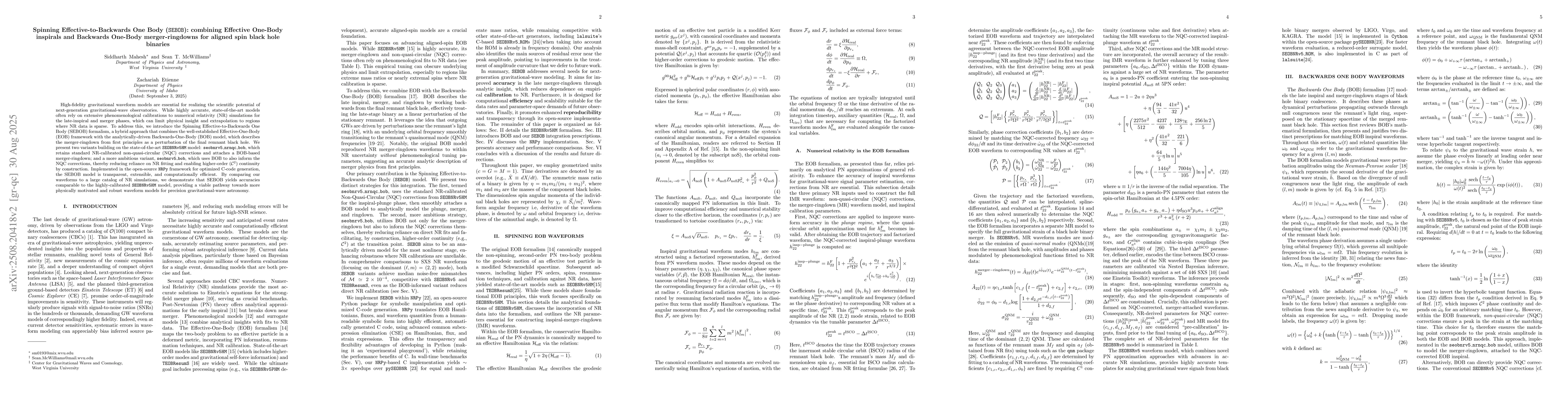 High-fidelity gravitational waveform models are essential for realizing the scientific potential of next-generation gravitational-wave observatories. While highly accurate, state-of-the-art models often rely on extensive phenomenological calibrations to numerical relativity (NR) simulations for the late-inspiral and merger phases, which can limit physical insight and extrapolation to regions where NR data is sparse. To address this, we introduce the Spinning Effective-to-Backwards One Body (SEBOB) formalism, a hybrid approach that combines the well-established Effective-One-Body (EOB) framework with the analytically-driven Backwards-One-Body (BOB) model, which describes the merger-ringdown from first principles as a perturbation of the final remnant black hole. We present two variants building on the state-of-the-art $\texttt{SEOBNRv5HM}$ model: $\texttt{seobnrv5_nrnqc_bob}$, which retains standard NR-calibrated non-quasi-circular (NQC) corrections and attaches a BOB-based merger-ringdown; and a more ambitious variant, $\texttt{seobnrv5_bob}$, which uses BOB to also inform the NQC corrections, thereby reducing reliance on NR fitting and enabling higher-order ($\mathcal{C}^2$) continuity by construction. Implemented in the open-source $\texttt{NRPy}$ framework for optimized C-code generation, the SEBOB model is transparent, extensible, and computationally efficient. By comparing our waveforms to a large catalog of NR simulations, we demonstrate that SEBOB yields accuracies comparable to the highly-calibrated $\texttt{SEOBNRv5HM}$ model, providing a viable pathway towards more physically motivated and robust waveform models