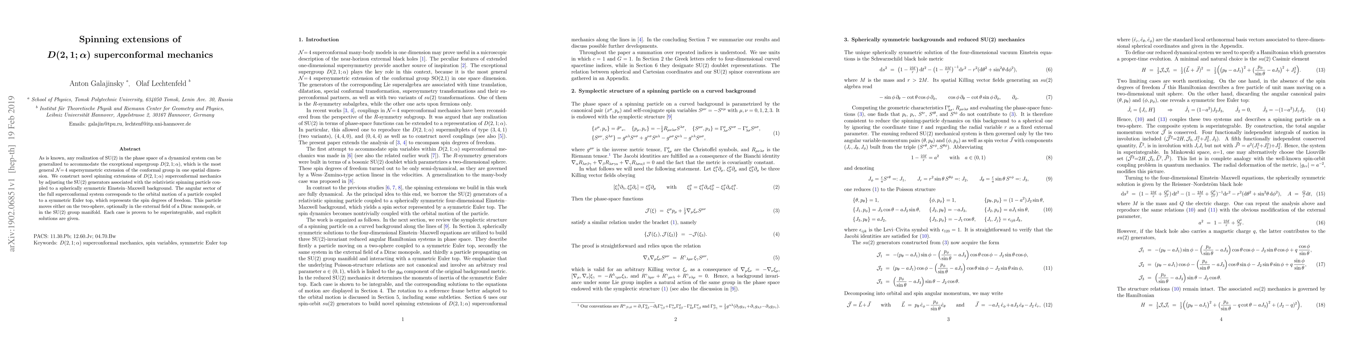 The paper constructs novel spinning extensions of $D(2,1;\alpha)$ superconformal mechanics by linking relativistic spinning particles to a spherically symmetric Einstein-Maxwell background, demonstrating superintegrability and providing explicit solutions for various scenarios, including a Dirac monopole and SU(2) group manifold.