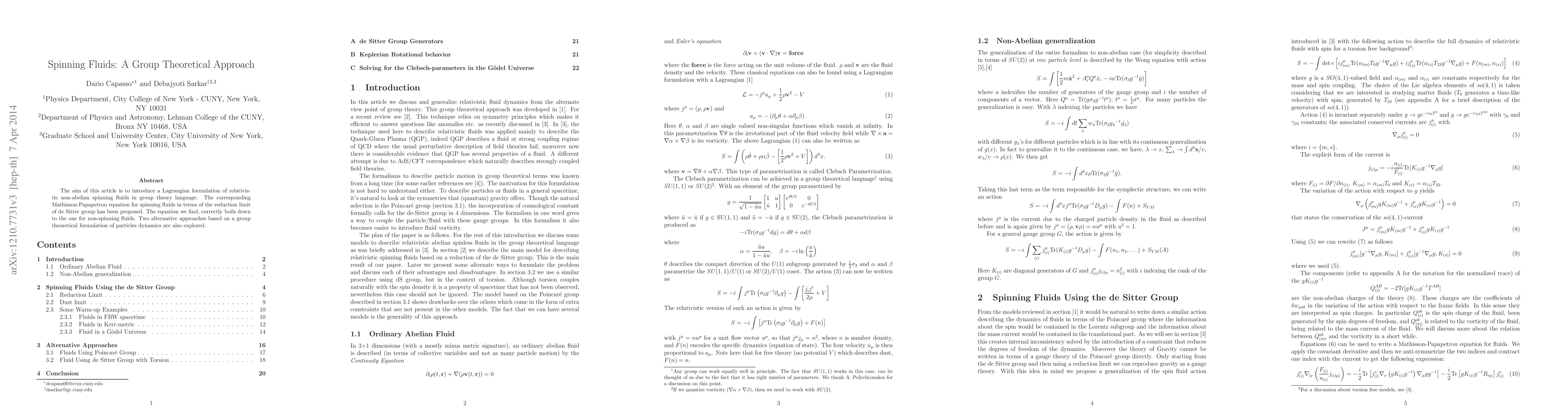 We extend the Lagrangian formulation of relativistic non-abelian fluids in group theory language. We propose a Mathisson-Papapetrou equation for spinning fluids in terms of the reduction limit of de Sitter group. The equation we find correctly boils down to the one for non-spinning fluids. We study the application of our results for an FRW cosmological background for fluids with no vorticity and for dusts in the vicinity of a Kerr black hole. We also explore two alternative approaches based on a group theoretical formulation of particles dynamics.