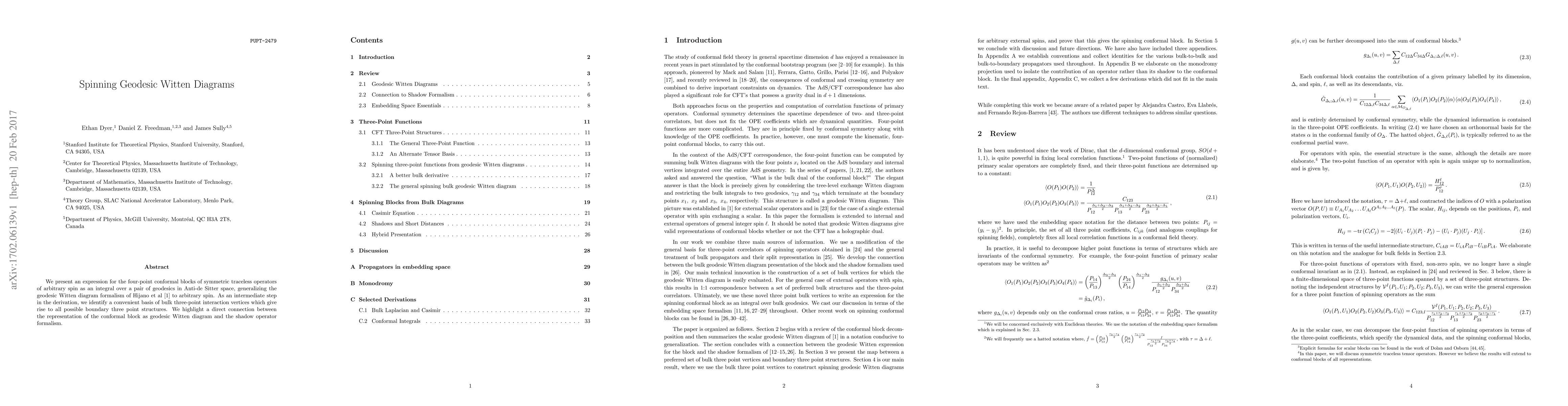 This paper generalizes the geodesic Witten diagram formalism to compute four-point conformal blocks of symmetric traceless operators of arbitrary spin via an integral over geodesics in Anti-de Sitter space, establishing a connection to the shadow operator formalism. It introduces a basis for bulk three-point vertices that generate all possible boundary three-point structures.
