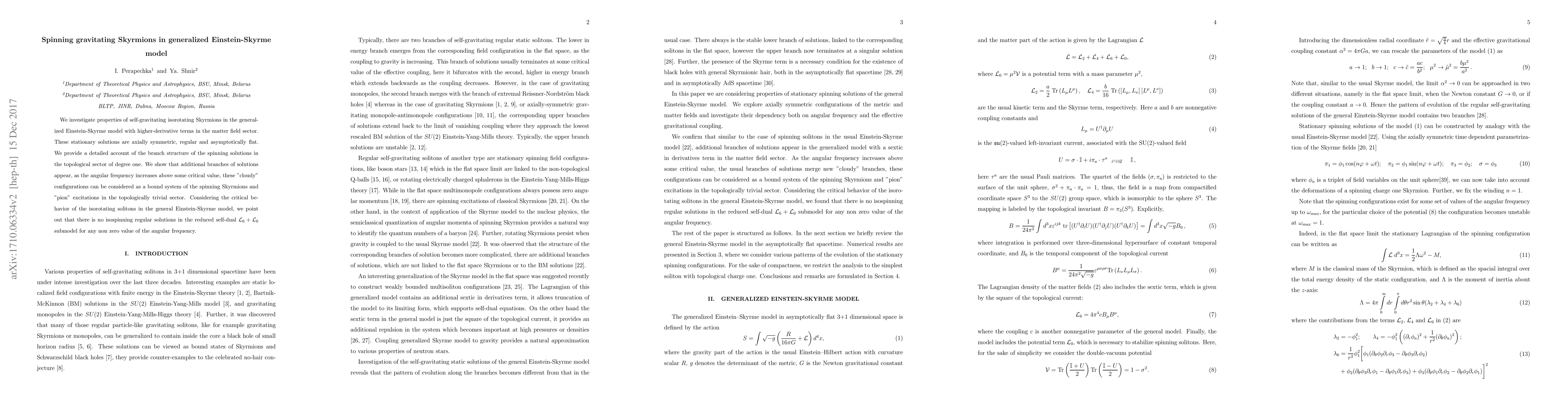 This research examines self-gravitating, isorotating Skyrmions in a generalized Einstein-Skyrme model with higher-derivative terms, revealing axially symmetric, regular, and asymptotically flat stationary solutions. It identifies additional solution branches for higher angular frequencies, indicating a bound system of spinning Skyrmions and pion excitations.