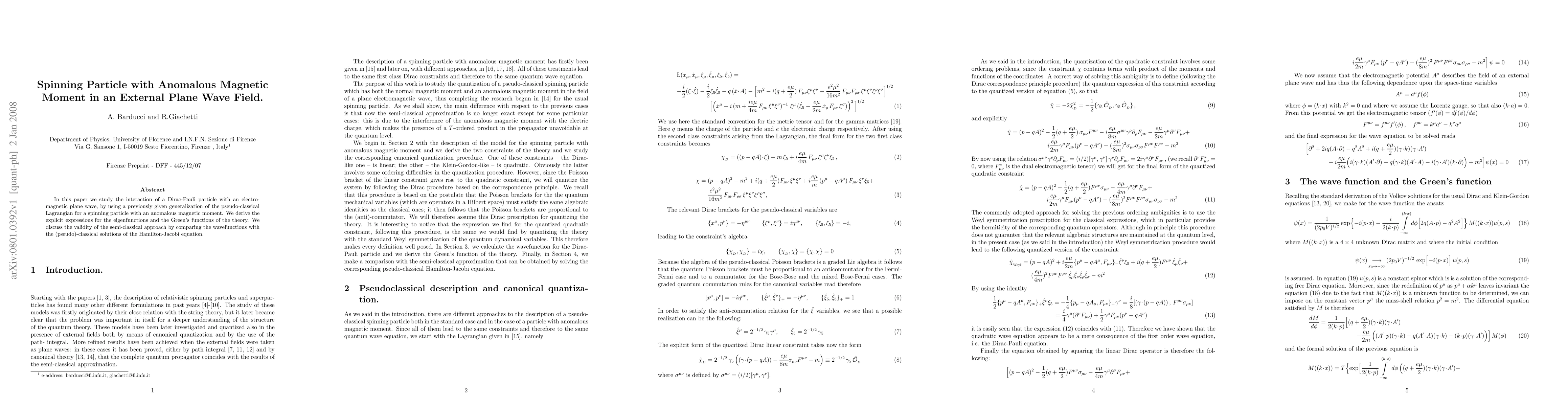This paper investigates the interaction of a spinning particle with an anomalous magnetic moment in an electromagnetic plane wave using a generalized pseudo-classical Lagrangian. It derives explicit expressions for eigenfunctions and Green's functions, and validates the semi-classical approach by comparing wavefunctions with classical solutions from the Hamilton-Jacobi equation.