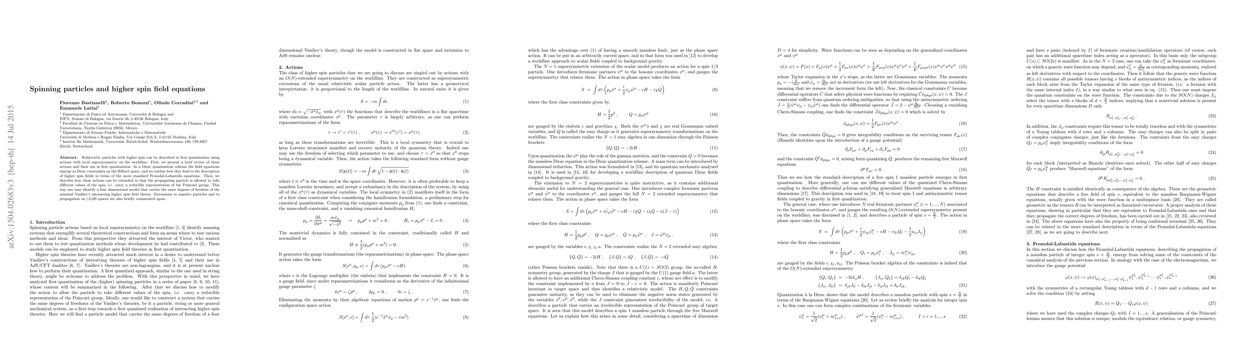Relativistic particles with higher spin can be described in first quantization using actions with local supersymmetry on the worldline. First, we present a brief review of these actions and their use in first quantization. In a Dirac quantization scheme the field equations emerge as Dirac constraints on the Hilbert space, and we outline how they lead to the description of higher spin fields in terms of the more standard Fronsdal-Labastida equations. Then, we describe how these actions can be extended so that the propagating particle is allowed to take different values of the spin, i.e. carry a reducible representation of the Poincar\'e group. This way one may identify a four dimensional model that carries the same degrees of freedom of the minimal Vasiliev's interacting higher spin field theory. Extensions to massive particles and to propagation on (A)dS spaces are also briefly commented upon.