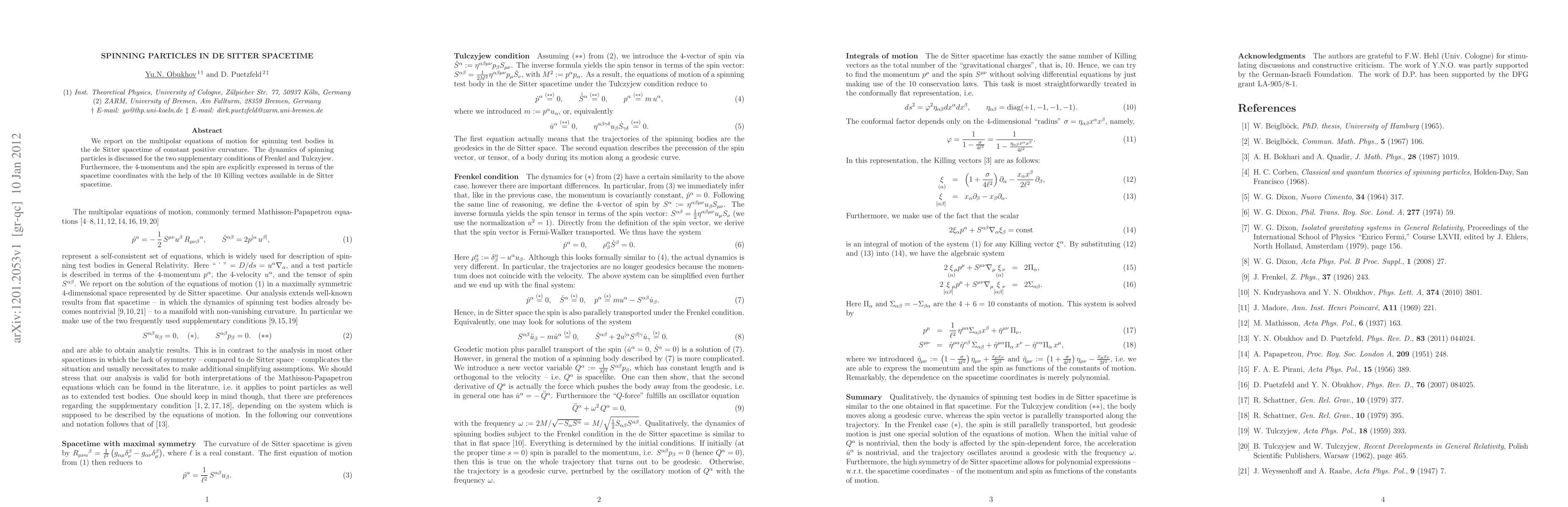 We report on the multipolar equations of motion for spinning test bodies in the de Sitter spacetime of constant positive curvature. The dynamics of spinning particles is discussed for the two supplementary conditions of Frenkel and Tulczyjew. Furthermore, the 4-momentum and the spin are explicitly expressed in terms of the spacetime coordinates with the help of the 10 Killing vectors available in de Sitter spacetime.