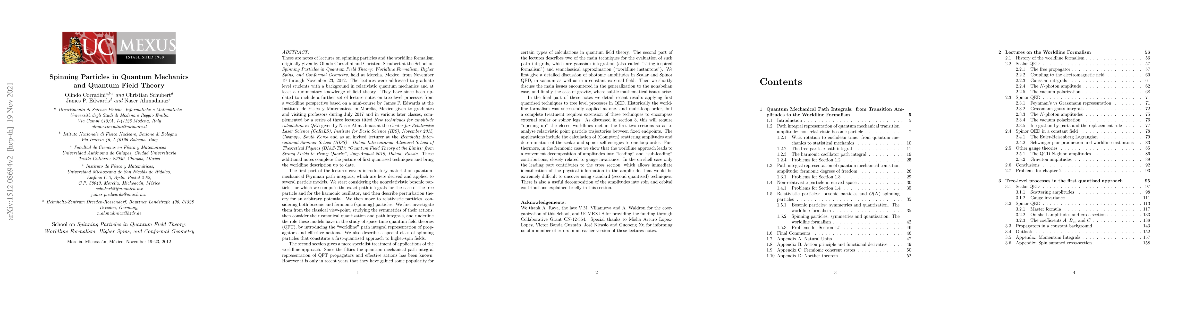 These are notes of lectures on spinning particles and the worldline formalism originally given by Olindo Corradini and Christian Schubert at the School on Spinning Particles in Quantum Field Theory: Worldline Formalism, Higher Spins, and Conformal Geometry, held at Morelia, Mexico, from November 19 through November 23, 2012. The lectures were addressed to graduate level students with a background in relativistic quantum mechanics and at least a rudimentary knowledge of field theory. They have since been updated to include a further set of lecture notes on tree level processes from a worldline perspective based on a mini-course by James P. Edwards at the Instituto de Fisica y Matematicas in Morelia, Mexico given to graduates and visiting professors during July 2017 and in various later classes, complemented by a series of three lectures titled New techniques for amplitude calculation in QED given by Naser Ahmadiniaz at the Center for Relativistic Laser Science (CoReLS), Institute for Basic Science(IBS), November 2015, Gwangju, South Korea and as an invited lecturer at the Helmholtz International Summer School (HISS) - Dubna International Advanced School of Theoretical Physics (DIAS-TH): 'Quantum Field Theory at the Limits: from Strong Fields to Heavy Quarks', July-August 2019, Dubna, Russia. These additional notes complete the picture of first quantised techniques and bring the worldline description up to date. The extended Abstract can be found in the manuscript.