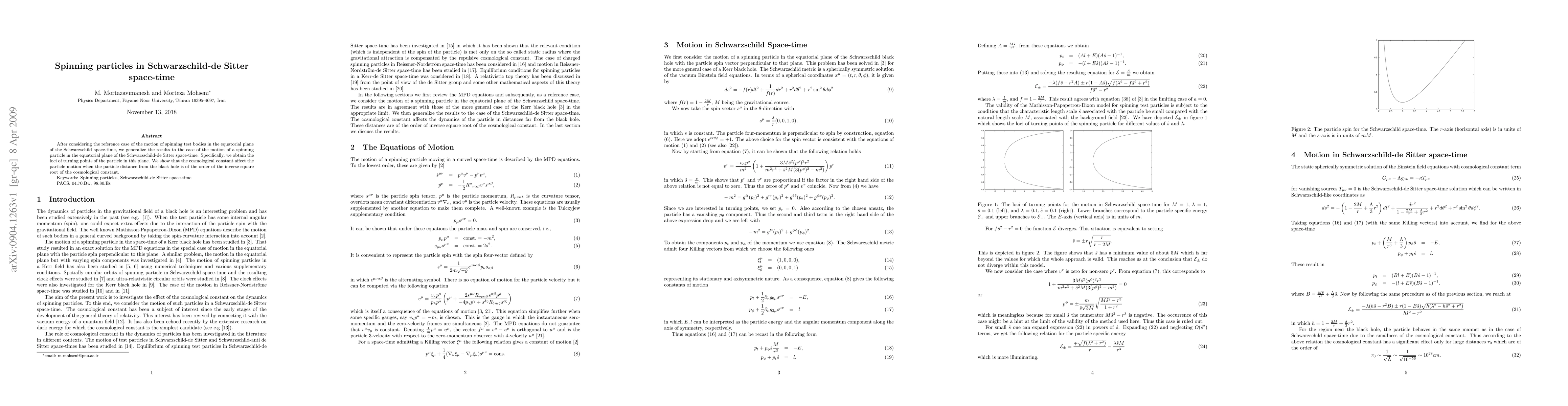 Summary: This paper generalizes the motion of spinning particles in Schwarzschild space-time to Schwarzschild-de Sitter space-time, focusing on the equatorial plane. It identifies the turning points influenced by the cosmological constant when the particle is near the black hole's event horizon.