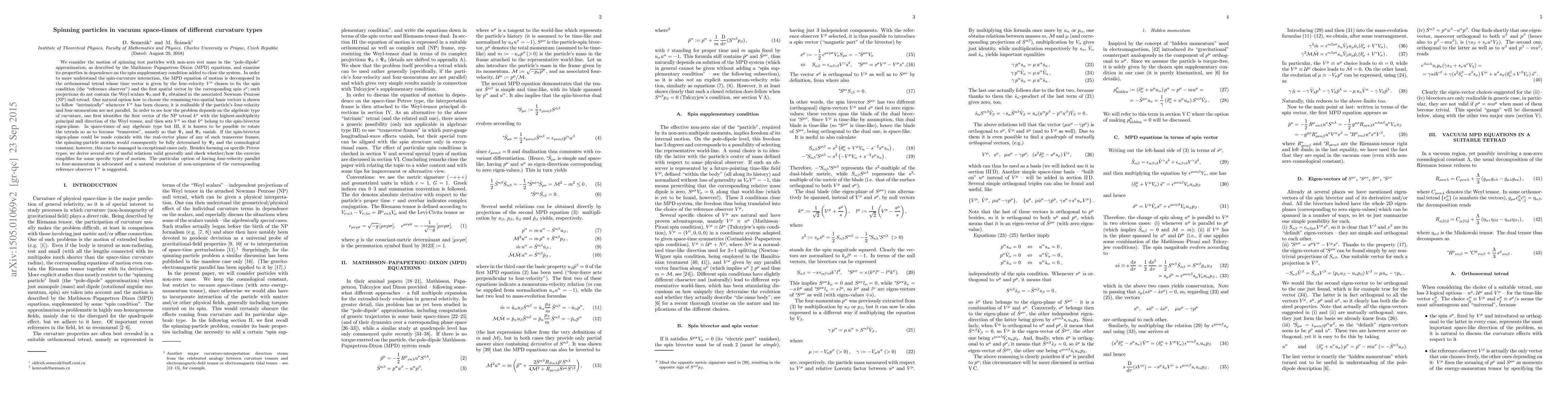 This paper investigates the motion of spinning particles in vacuum spacetimes using the Mathisson-Papapetrou-Dixon equations, focusing on the influence of different spin supplementary conditions and curvature types. It explores how the motion simplifies under specific Petrov types and proposes a resolution for the nonuniqueness of the reference observer when the four-velocity is parallel to the four-momentum.