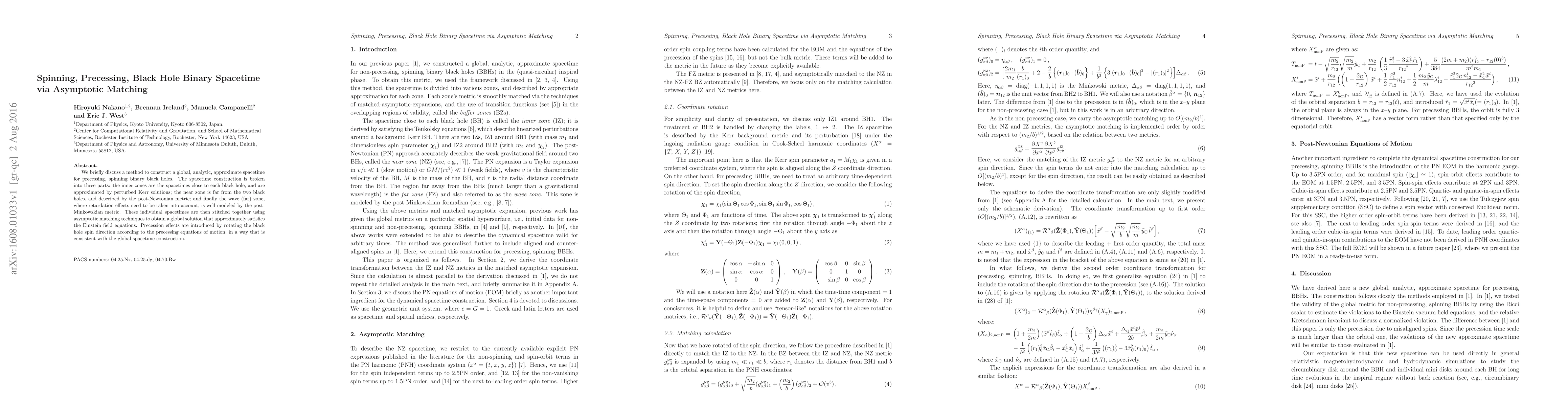 We briefly discuss a method to construct a global, analytic, approximate spacetime for precessing, spinning binary black holes. The spacetime construction is broken into three parts: the inner zones are the spacetimes close to each black hole, and are approximated by perturbed Kerr solutions; the near zone is far from the two black holes, and described by the post-Newtonian metric; and finally the wave (far) zone, where retardation effects need to be taken into account, is well modeled by the post-Minkowskian metric. These individual spacetimes are then stitched together using asymptotic matching techniques to obtain a global solution that approximately satisfies the Einstein field equations. Precession effects are introduced by rotating the black hole spin direction according to the precessing equations of motion, in a way that is consistent with the global spacetime construction.