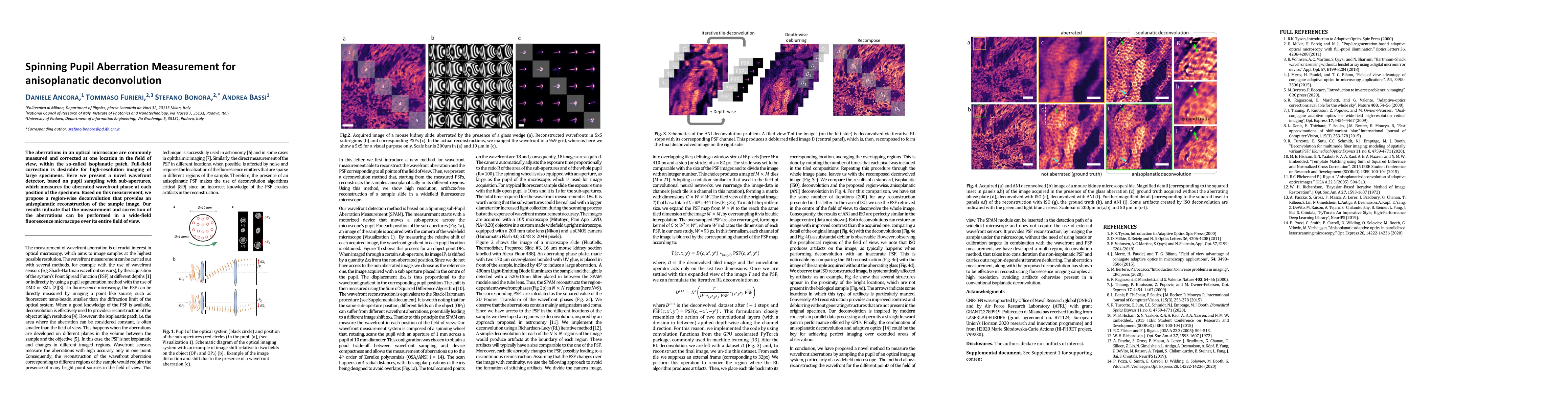 The aberrations in an optical microscope are commonly measured and corrected at one location in the field of view, within the so-called isoplanatic patch. Full-field correction is desirable for high-resolution imaging of large specimens. Here we present a novel wavefront detector, based on pupil sampling with sub-apertures, which measures the aberrated wavefront phase at each position of the specimen. Based on this measurement, we propose a region-wise deconvolution that provides an anisoplanatic reconstruction of the sample image. Our results indicate that the measurement and correction of the aberrations can be performed in a wide-field fluorescence microscope over its entire field of view.