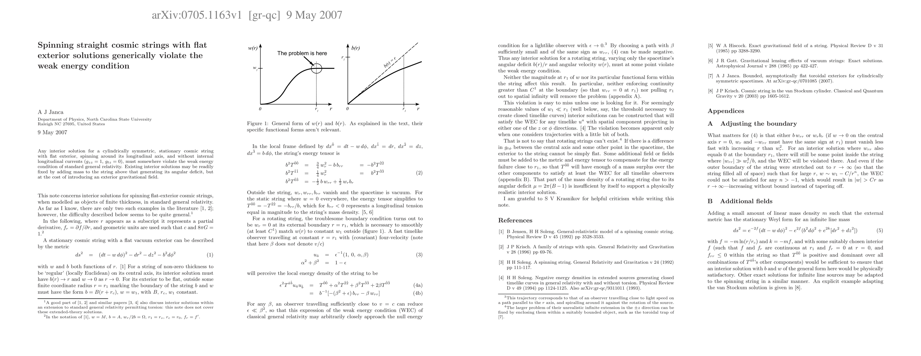 Summary: Spinning cosmic strings with flat exteriors inherently violate the weak energy condition in general relativity. Solutions can be adjusted by adding mass, though this introduces an exterior gravitational field.