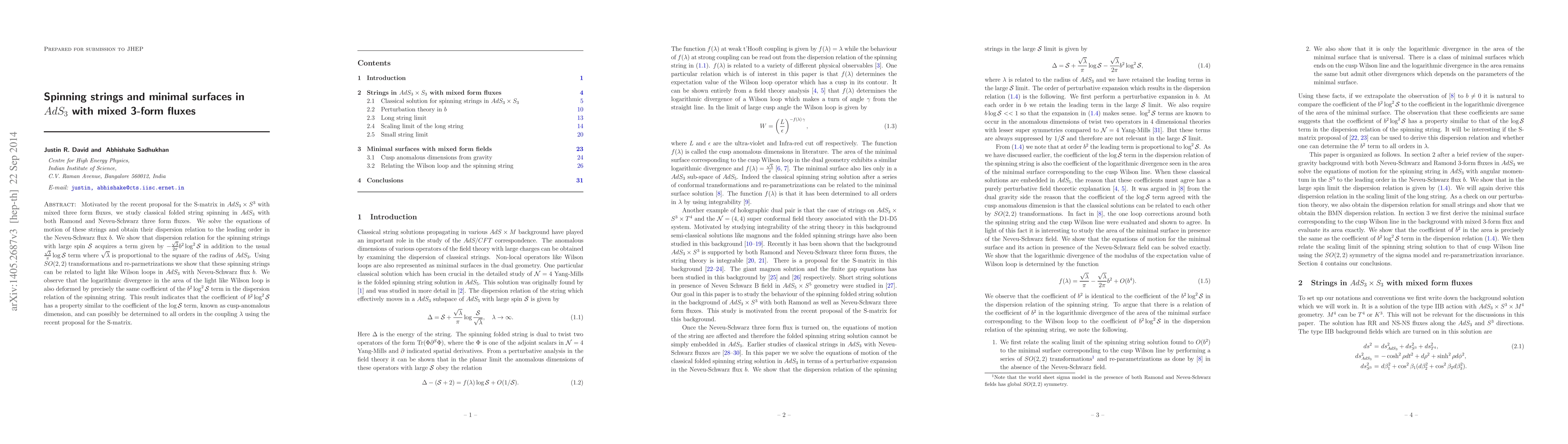 Motivated by the recent proposal for the S-matrix in $AdS_3\times S^3$ with mixed three form fluxes, we study classical folded string spinning in $AdS_3$ with both Ramond and Neveu-Schwarz three form fluxes. We solve the equations of motion of these strings and obtain their dispersion relation to the leading order in the Neveu-Schwarz flux $b$. We show that dispersion relation for the spinning strings with large spin ${\cal S}$ acquires a term given by $-\frac{\sqrt{\lambda}}{2\pi} b^2\log^2 {\cal S}$ in addition to the usual $\frac{\sqrt\lambda}{\pi} \log {\cal S}$ term where $\sqrt{\lambda}$ is proportional to the square of the radius of $AdS_3$. Using SO(2,2) transformations and re-parmetrizations we show that these spinning strings can be related to light like Wilson loops in $AdS_3$ with Neveu-Schwarz flux $b$. We observe that the logarithmic divergence in the area of the light like Wilson loop is also deformed by precisely the same coefficient of the $ b^2 \log^2 {\cal S}$ term in the dispersion relation of the spinning string. This result indicates that the coefficient of $ b^2 \log^2 {\cal S}$ has a property similar to the coefficient of the $\log {\cal S}$ term, known as cusp-anomalous dimension, and can possibly be determined to all orders in the coupling $\lambda$ using the recent proposal for the S-matrix.