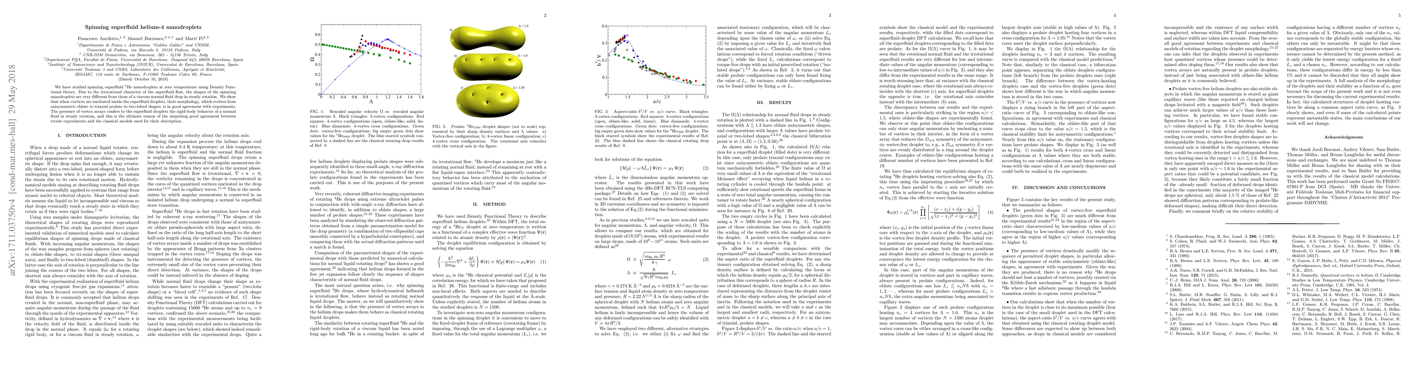Density Functional Theory (DFT) was used to study spinning superfluid helium-4 nanodroplets at zero temperature. The total energy of a 4HeN droplet was expressed as a functional of a complex effective wave function Ψ(r), related to its atomic density by ρ(r) = |Ψ(r)|². The droplet's equilibrium configuration was obtained by solving the equation H[ρ]Ψ(r) = µ4Ψ(r), where H[ρ] = -ħ²/2mHe∇² + δEc/δρ and Ec[ρ] is the correlation energy, taken from Ref.26.