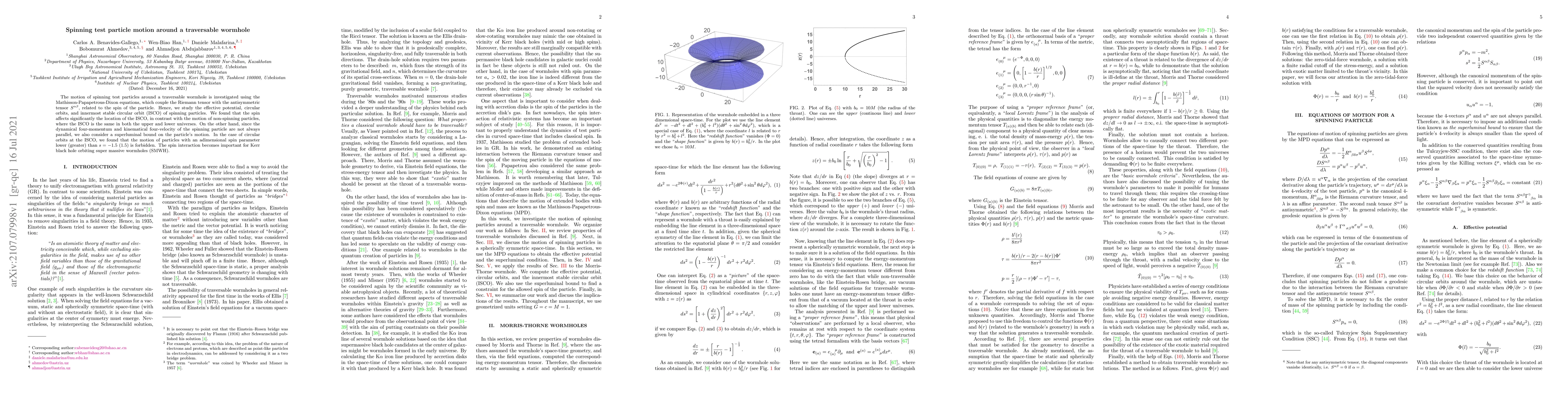 The motion of spinning test particles around a traversable wormhole is investigated using the Mathisson Papapetrous Dixon equations, which couple the Riemann tensor with the antisymmetric tensor $S^{ab}$, related to the spin of the particle. Hence, we study the effective potential, circular orbits, and innermost stable circular orbit ISCO of spinning particles. We found that the spin affects significantly the location of the ISCO, in contrast with the motion of nonspinning particles, where the ISCO is the same in both the upper and lower universes. On the other hand, since the dynamical fourmomentum and kinematical fourvelocity of the spinning particle are not always parallel, we also consider a superluminal bound on the particles motion. In the case of circular orbits at the ISCO, we found that the motion of particles with an adimensional spin parameter lower greater than $s=-1.5$ $(1.5)$ is forbidden. The spin interaction becomes important for Kerr black hole orbiting super massive wormholes SMWH.