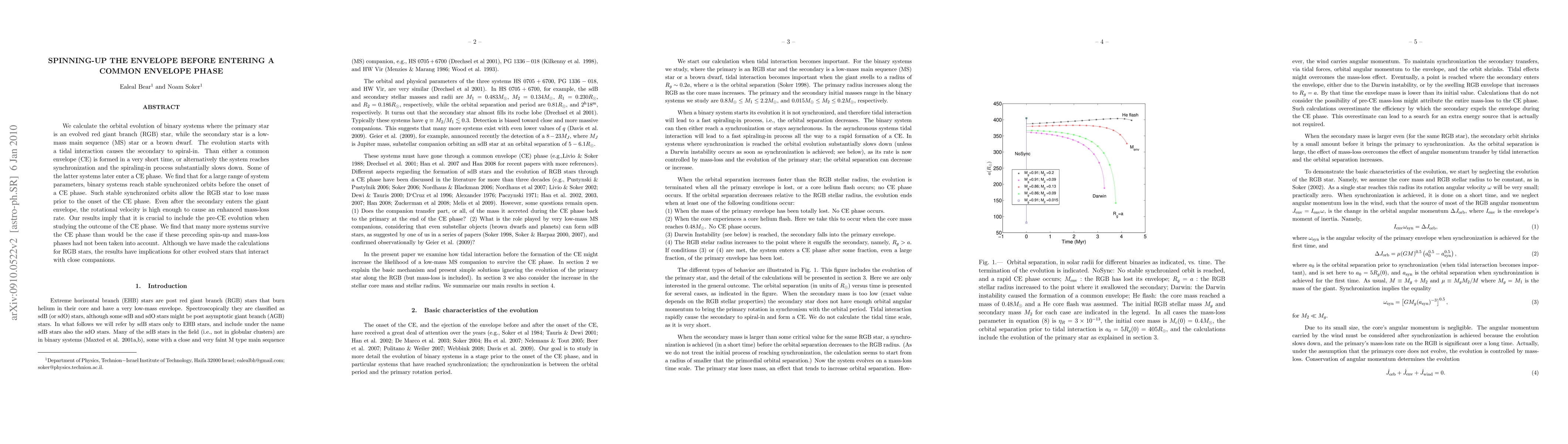 We calculate the orbital evolution of binary systems where the primary star is an evolved red giant branch (RGB) star, while the secondary star is a low-mass main sequence (MS) star or a brown dwarf. The evolution starts with a tidal interaction causes the secondary to spiral-in. Than either a common envelope (CE) is formed in a very short time, or alternatively the system reaches synchronization and the spiraling-in process substantially slows down. Some of the latter systems later enter a CE phase. We find that for a large range of system parameters, binary systems reach stable synchronized orbits before the onset of a CE phase. Such stable synchronized orbits allow the RGB star to lose mass prior to the onset of the CE phase. Even after the secondary enters the giant envelope, the rotational velocity is high enough to cause an enhanced mass-loss rate. Our results imply that it is crucial to include the pre-CE evolution when studying the outcome of the CE phase. We find that many more systems survive the CE phase than would be the case if these preceding spin-up and mass-loss phases had not been taken into account. Although we have made the calculations for RGB stars, the results have implications for other evolved stars that interact with close companions.